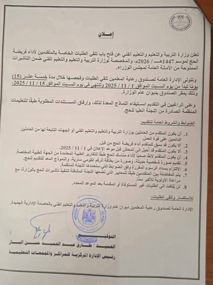 أعلنت وزارة التربية والتعليم والتعليم الفني عن فتح باب تلقي الطلبات الخاصة بالمتقدمين لأداء فريضة الحج لموسم 1447هـ / 2026م، والمخصصة لوزارة التربية والتعليم والتعليم الفني ضمن التأشيرات الممنوحة من الأمانة العامة لمجلس الوزراء.