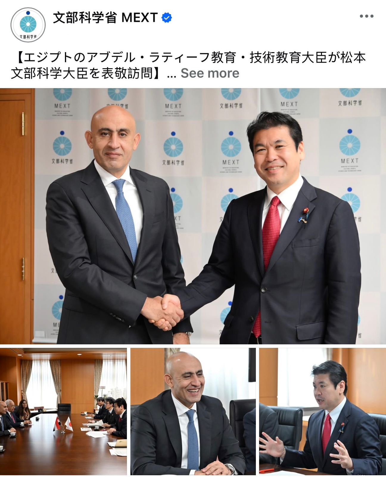 أشاد وزير التعليم والثقافة والرياضة والعلوم والتكنولوجيا في دولة اليابان يوهى ماتسوموتو بلقائه بالسيد محمد عيد اللطيف وزير التربية والتعليم والتعليم الفني، وذلك عبر صفحاته الرسمية على مواقع التواصل الاجتماعي.