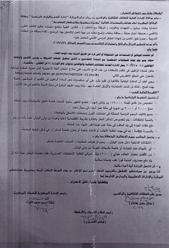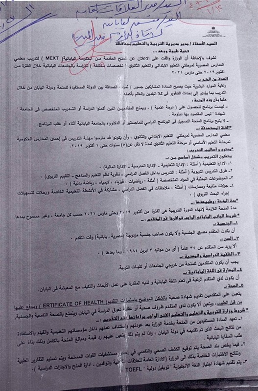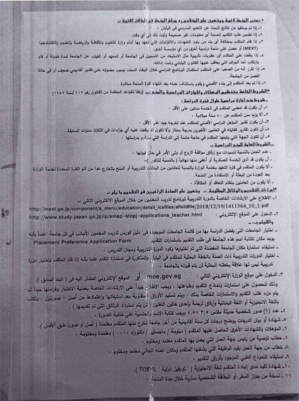 وافقت وزارة التربية والتعليم والتعليم الفني، علي الإعلان عن المنح المقدمة من الحكومة اليايانية ( MEXT ) لتدريب معلمى المدارس المصرية لمرحلتي التعليم الابتدائى والثانوي للدراسة بالجامعات اليابانية.