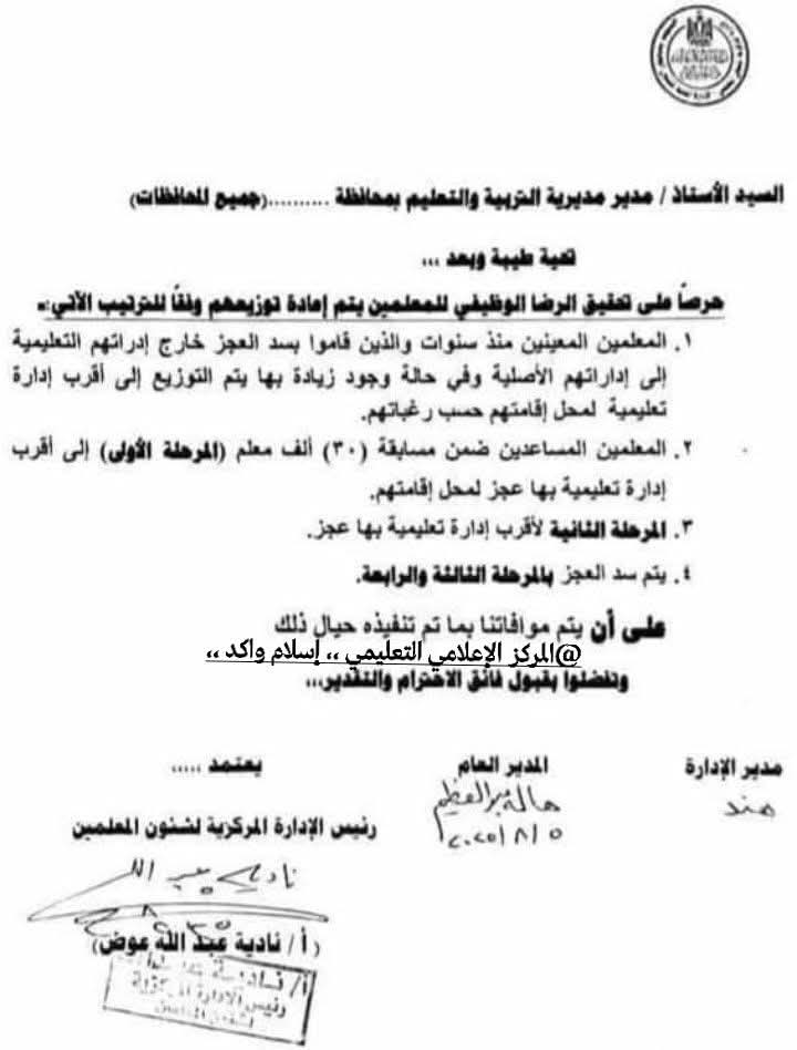 - المعلمين المساعدين ضمن مسابقة (۳۰) ألف معلم (المرحلة الأولى إلى أقرب إدارة تعليمية بها عجز المحل إقامتهم.