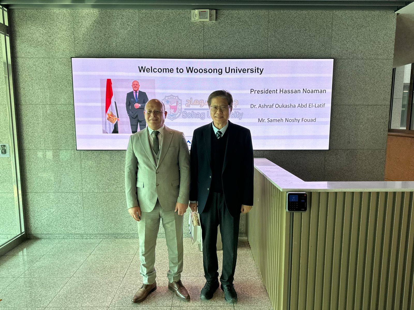 بمدينة Daejeon فى جمهورية كوريا الجنوبية، وعقد لقاء متميز مع الدكتور Ohio الرئيس الفخرى لجامعة Woosong College، والدكتور Go-Whan Jin رئيس جامعة Woosong، تم خلاله بحث سبل التعاون الأكاديمي والبحثي بين الجامعتين، والبدء بتشكيل فرق عمل من الجامعتين لوضع خطة تنفيذية للبرامج المقترحة والبدء بتفعيلها وذلك فى مجالات الذكاء الاصطناعي (Artificial Intelligence) وإدارة تصميم الجمال (Beauty Design Management)، بالإضافة إلى دراسة إنشاء فرع لجامعة Woosong داخل جامعة سوهاج، إلى جانب برامج تبادل أعضاء هيئة التدريس والطلاب والمشروعات البحثية المشتركة، وإطلاق دورات تدريبية تقدمها جامعة ووسونج في مجال التجميل ومستحضرات التجميل؛ مقدما الشكر لرئيس جامعة Woosong على التعاون المتميز وحفاوه الاستقبال والترحيب الخاص.
