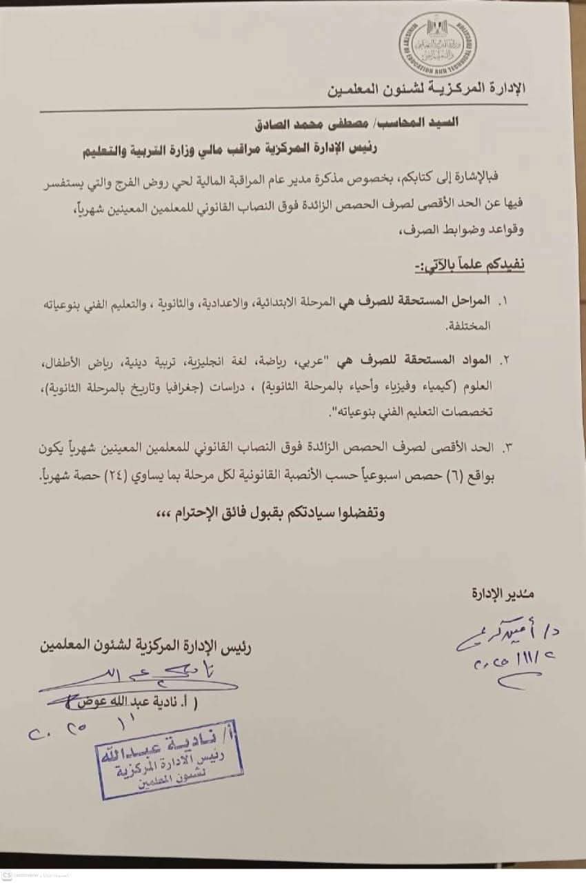 - الحد الأقصى لصرف الحصص الزائدة فوق النصاب القانوني للمعلمين المعينين شهريًا يكون بواقع (1) حصص أسبوعيا حسب الأنصبه القانونية لكل مرحلة بما يساوي (٢٤) حصة شهريًا.