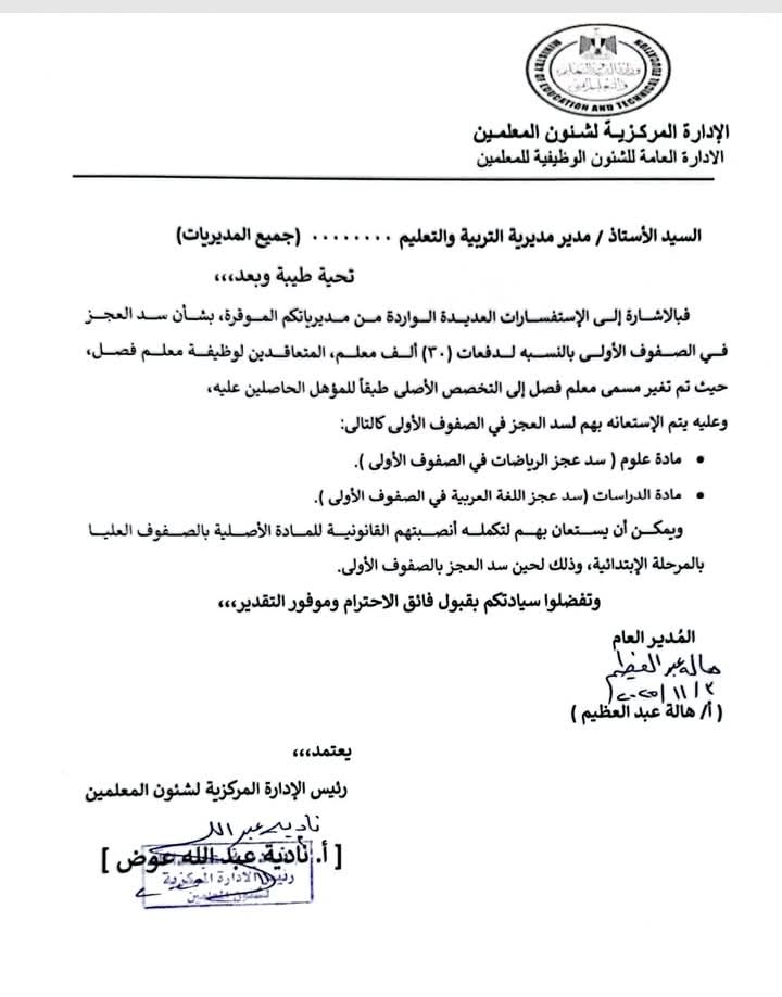 أعلنت وزارة التربية والتعليم والتعليم الفني، عن توجيهات جديدة للمديريات التعليمية، لاستكمال «خطة سد عجز المعلمين في المدارس».