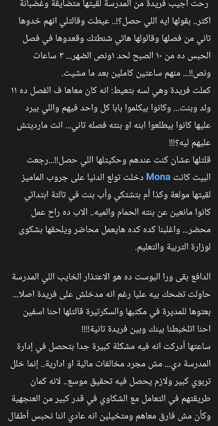 وشددت على أن غياب الوعي بخطورة الأثر النفسي لمثل هذه التصرفات على الأطفال يمثل أزمة حقيقية، إذ إن احتجاز الطالبة بهذا الشكل أفقدها الشعور بالأمان، وألحق بها أضرارًا نفسية عميقة من شعور بالذل والإهانة والخوف من البيئة المدرسية.