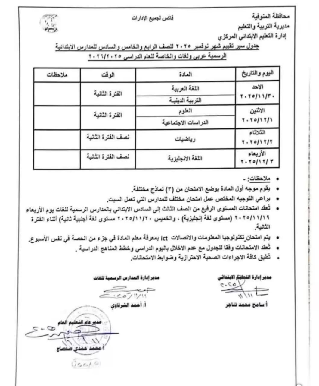 جدول امتحانات شهر نوفمبر 2025 جميع المراحل محافظة المنوفية