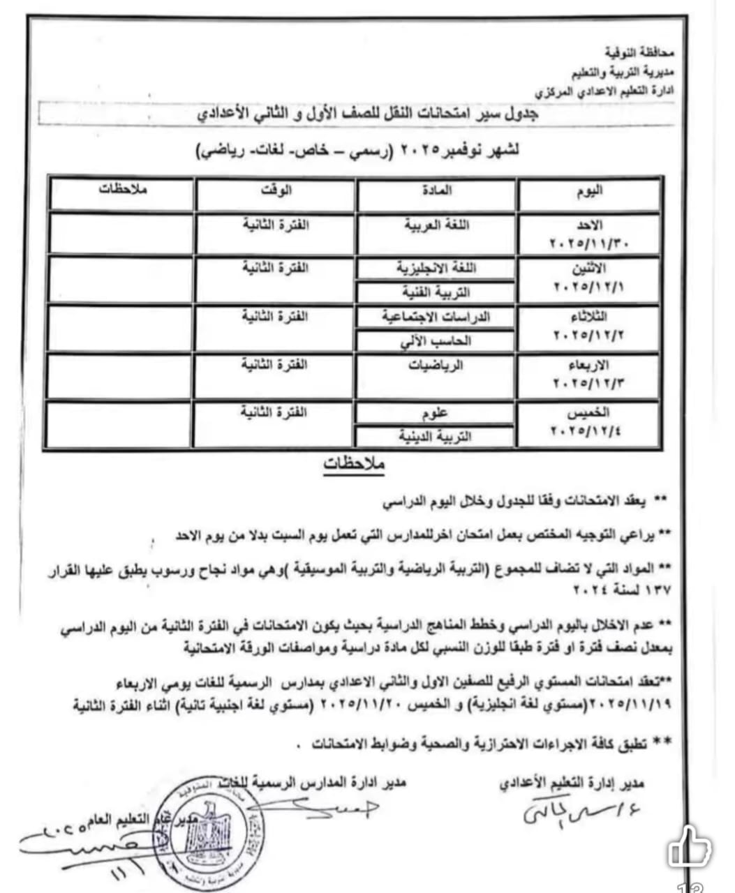 ننشر جدول امتحانات شهر نوفمبر 2025 جميع المراحل محافظة المنوفية