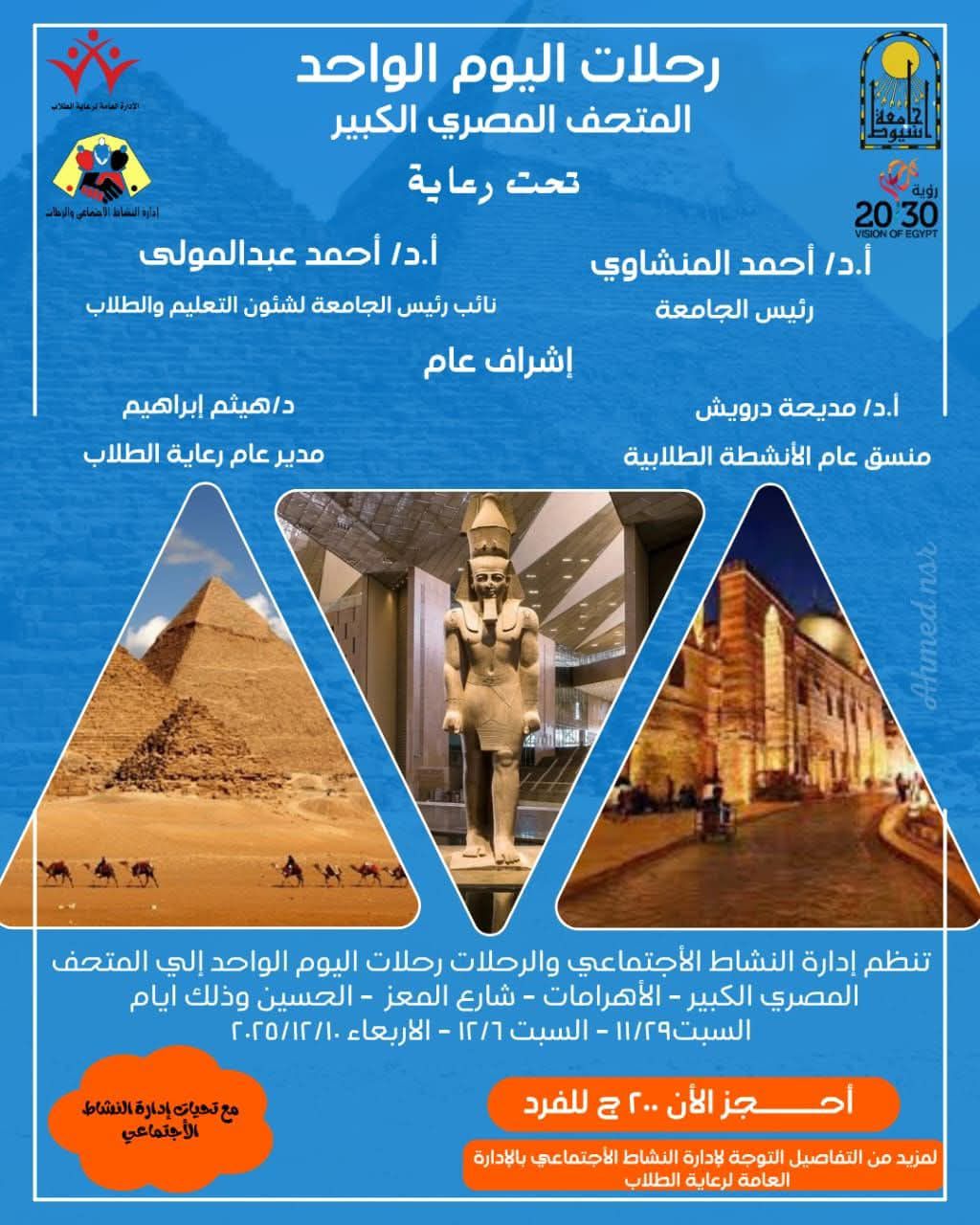 أعلنت جامعة أسيوط عن تنظيم سلسلة من رحلات اليوم الواحد إلى المتحف المصري الكبير، وذلك تحت رعاية الدكتور أحمد المنشاوي رئيس جامعة أسيوط، والدكتور أحمد عبدالمولى نائب رئيس جامعة أسيوط لشئون التعليم والطلاب، وبإشراف عام من الدكتورة مديحة درويش منسق عام الأنشطة الطلابية، والدكتور هيثم إبراهيم مدير عام رعاية الطلاب.