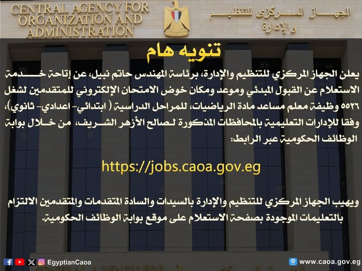 أعلن الجهاز المركزي للتنظيم والإدارة، برئاسة المهندس حاتم نبيل، عن إتاحة خدمة الاستعلام عن القبول المبدئي وموعد ومكان خوض الامتحان الإلكتروني للمتقدمين لشغل ٥٥٢٦ وظيفة معلم مساعد مادة الرياضيات للمراحل الدراسية ( ابتدائي - إعدادي - ثانوي).