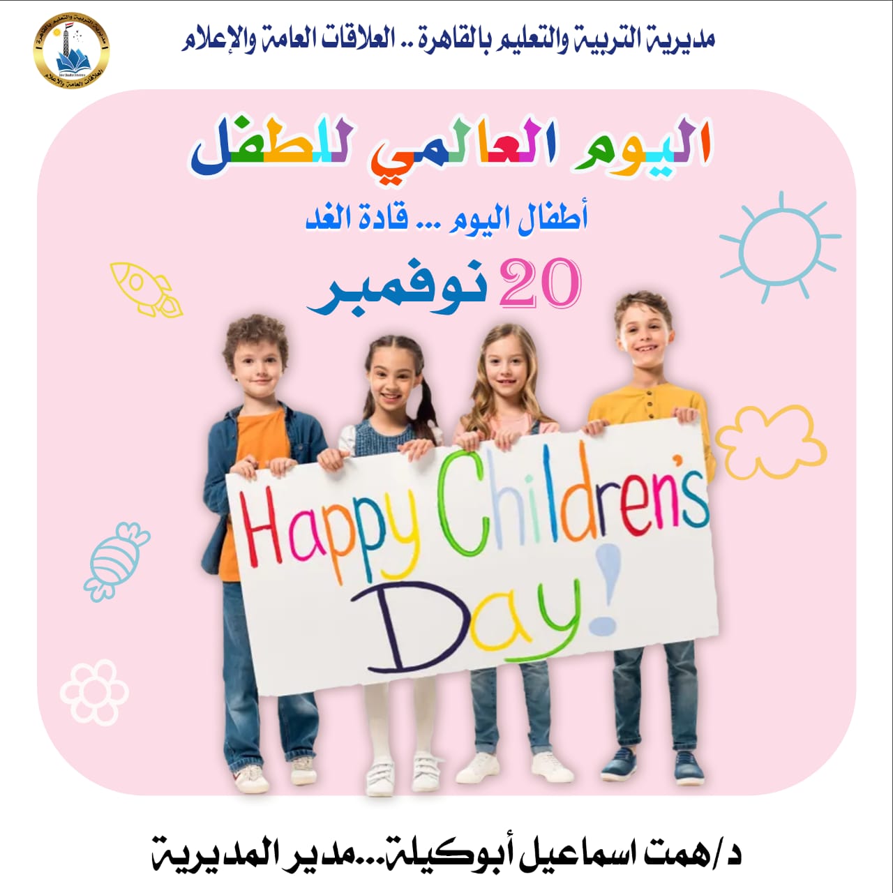 تحتفل مديرية التربية والتعليم بالقاهرة، اليوم الخميس، برعاية الدكتورة همت أبوكيلة، مدير المديرية، "باليوم العالمى للطفل"، والذى يوافق ٢٠ نوفمبر من كل عام.