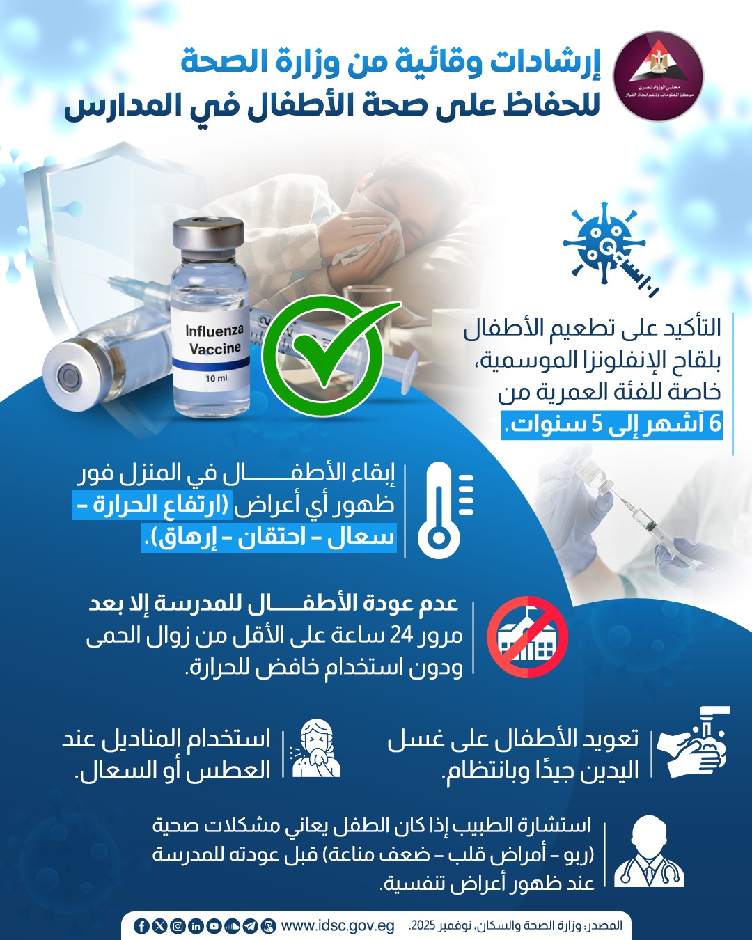• التأكيد على تطعيم الأطفال بلقاح الإنفلونزا الموسمية خاصة للفئة العمرية من 6 أشهر إلى 5 سنوات.