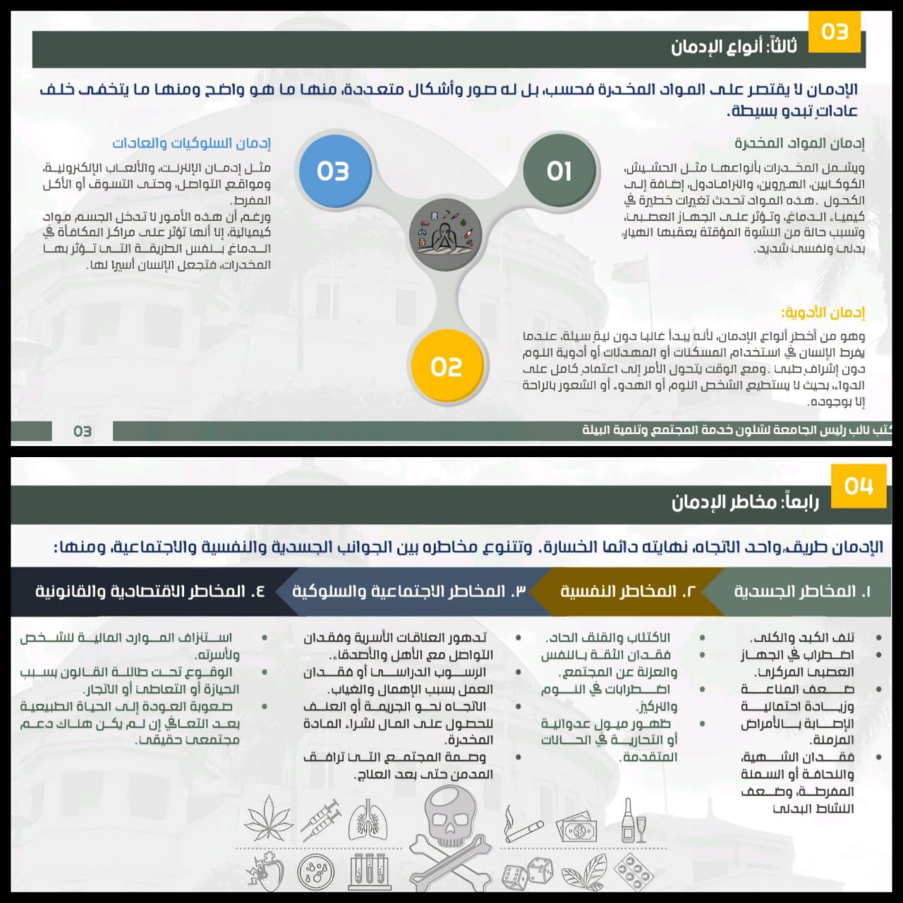 وتطرق التقرير، إلى تتظيم قسم الجلدية بكلية طب قصر العيني ندوة توعوية تحت شعار "لا للمخدرات" حاضر فيها مجموعة من المدرسين المساعدين المتخصصين في الأمراض الجلدية، وهم: الدكتورة منار سعيد، الدكتورة يمنى عاصم، والدكتورة هدير خضر.، كما صمم قسم الصحة العامة وطب المجتمع ملصقا ركز على توضيح مخاطر الادمان وتأثيرها على الصحة الجسدية والنفسية.