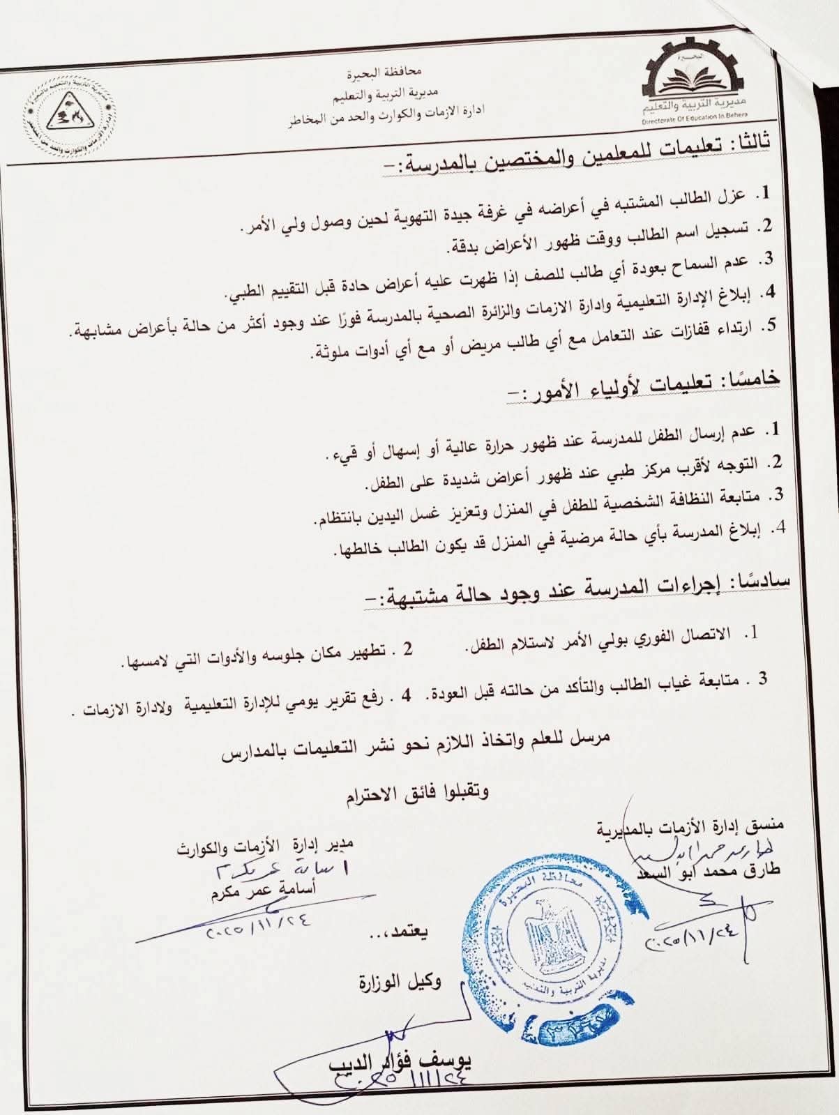4. إبلاغ الإدارة التعليمية وادارة الازمات والزائرة الصحية بالمدرسة فورا عند وجود أكثر من حالة بأعراض مشابهة.