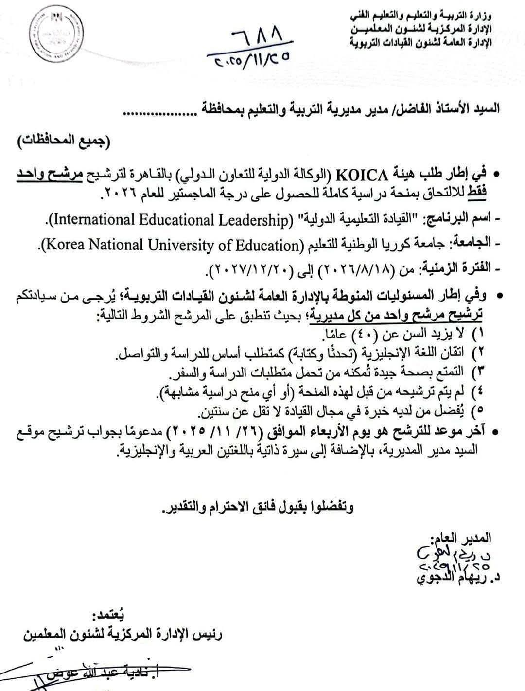 عممت وزارة التربية والتعليم خطابا على المديريات التعليمية في إطار طلب هيئة KOICA الوكالة الدولية للتعاون الدولي بالقاهرة لترشيح مرشح واحد فقط للالتحاق بمنحة دراسية كاملة للحصول على درجة الماجستير للعام ٢٠٢٦ )International Educational Leadership( "اسم البرنامج: "القيادة التعليمية الدولية -)Korea National University of Education( الجامعة جامعة كوريا الوطنية للتعليم -خلال الفترة الزمنية من (٢٠٢٥/۸/۱۸) إلى (۲۰۲۷/۱۲/۲۰).