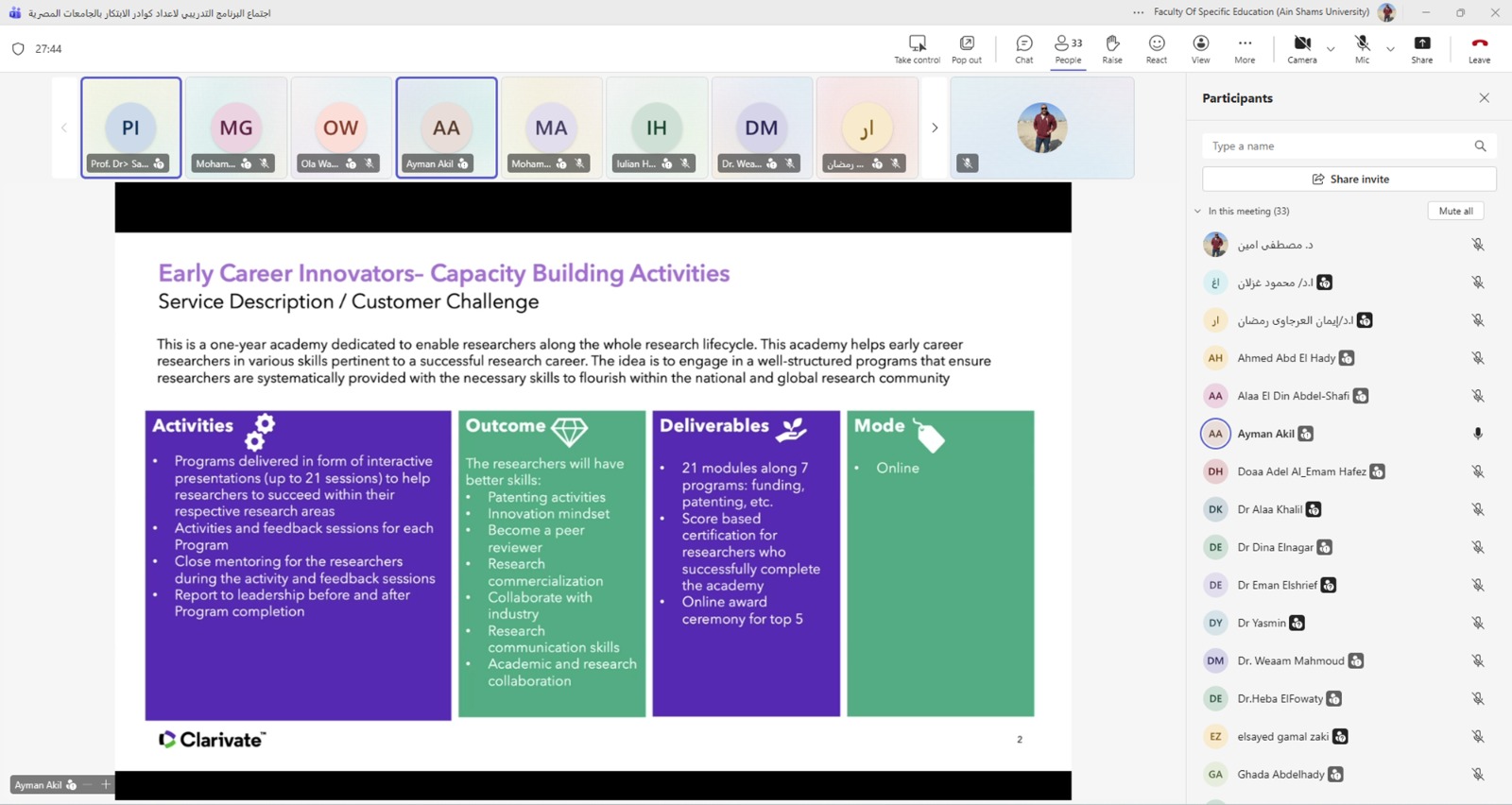 وخلال فعاليات الجلسة الافتتاحية، قدم الدكتور مصطفى أمين مدير برامج بالصندوق عرضًا تعريفيًّا حول منسقي الجامعات ودورهم في تعزيز منظومة الابتكار داخل المؤسسات الأكاديمية، كما قدم الدكتور أيمن عقيل ممثل شركة Clarivate عرضًا تفصيليًا حول خطة البرنامج وأهدافه وآليات تنفيذه داخل الجامعات، بحضور ممثلي 61 جامعة ومركزًا بحثيًّا من مختلف محافظات الجمهورية؛ بما يعكس حجم المشاركة والاهتمام بتعزيز بنية الابتكار في مصر.
