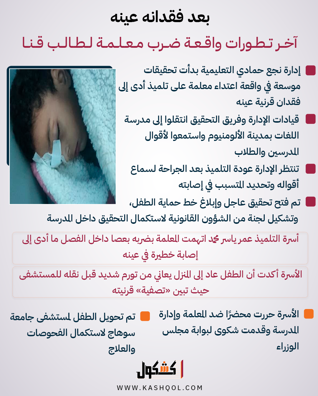 بعد فقدانه عينه.. آخر تطورات واقعة ضرب معلمة لطالب قنا «انفوجراف»