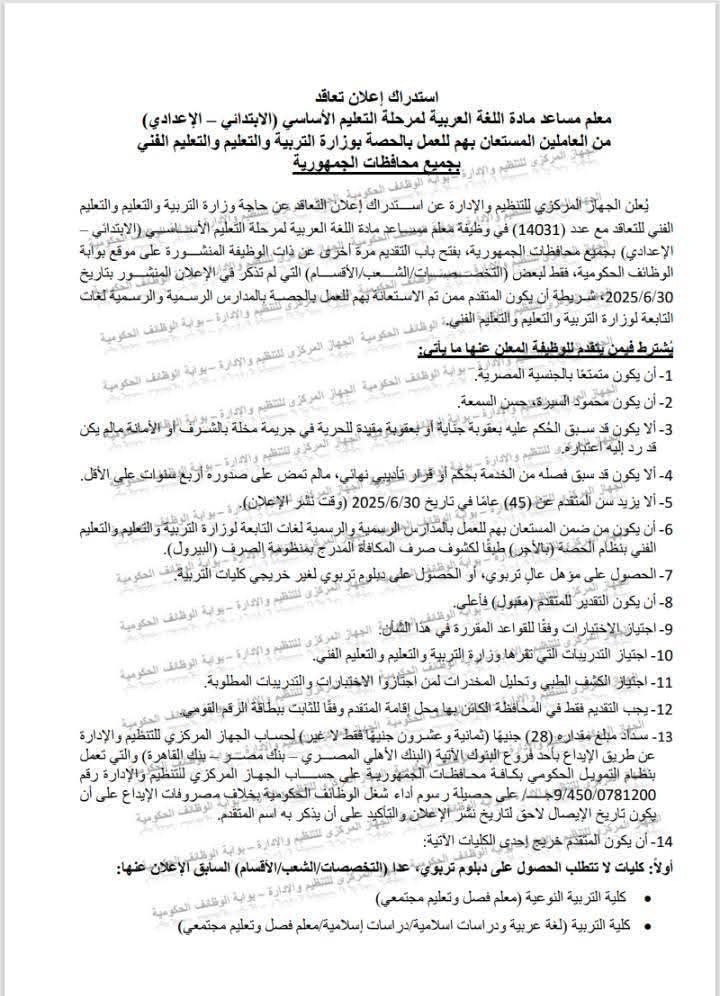 أعلن الجهاز المركزي للتنظيم والإدارة عن استدراك إعلان التعاقد عن حاجة وزارة التربية والتعليم والتعليم الفني للتعاقد مع عدد (14031) في وظيفة معلم مساعد مادة اللغة العربية لمرحلة التعليم الأساسي (الابتدائي -الإعدادي) بجميع محافظات الجمهورية.