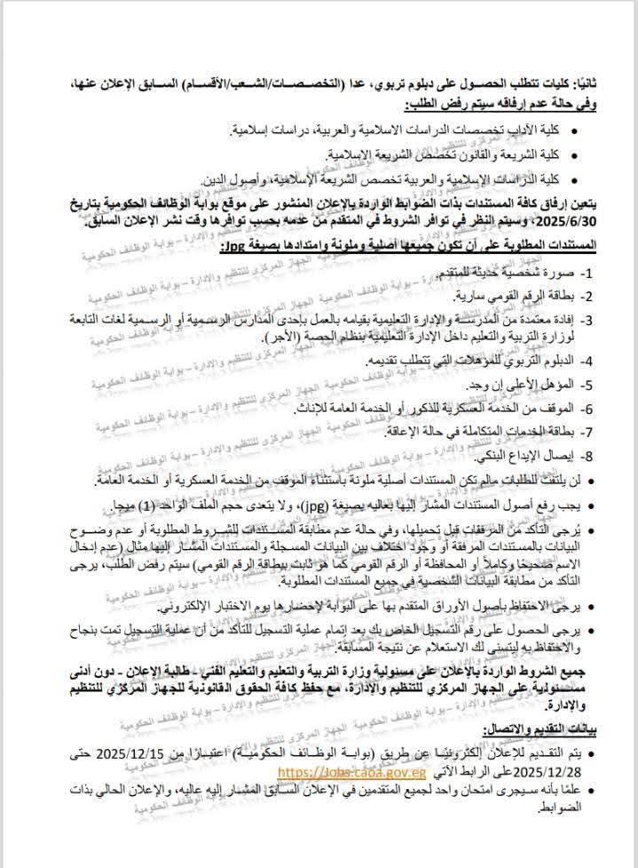وأشارت إلى أنه تم فتح باب التقديم مرة أخرى عن ذات الوظيفة المنشورة على موقع بوابة الوظائف الحكومية، فقط لبعض التخصصات الشعب الأقسام التي لم تذكر في الإعلان المنشور بتاريخ 2025/6/30، شريطة أن يكون المتقدم ممن تم الاستعانة بهم للعمل بالحصة بالمدارس الرسمية والرسمية لغات.