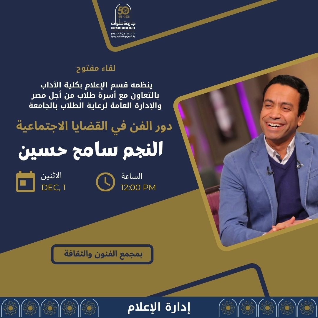 يستضيف مجمع الفنون والثقافة جامعة حلوان واحدًا من أبرز اللقاءات المفتوحة خلال العام الجامعي، وذلك في الفعالية التي ينظمها قسم الإعلام بكلية الآداب جامعة حلوان بالتعاون مع أسرة طلاب من أجل مصر المركزية، والإدارة العامة لرعاية الطلاب جامعة حلوان، تحت عنوان: دور الفن في القضايا الاجتماعية.. لقاء مفتوح مع النجم سامح حسين"، وذلك في إطار دور جامعة حلوان في تعزيز الوعي المجتمعي ودعم القضايا التي تمس الجمهور.