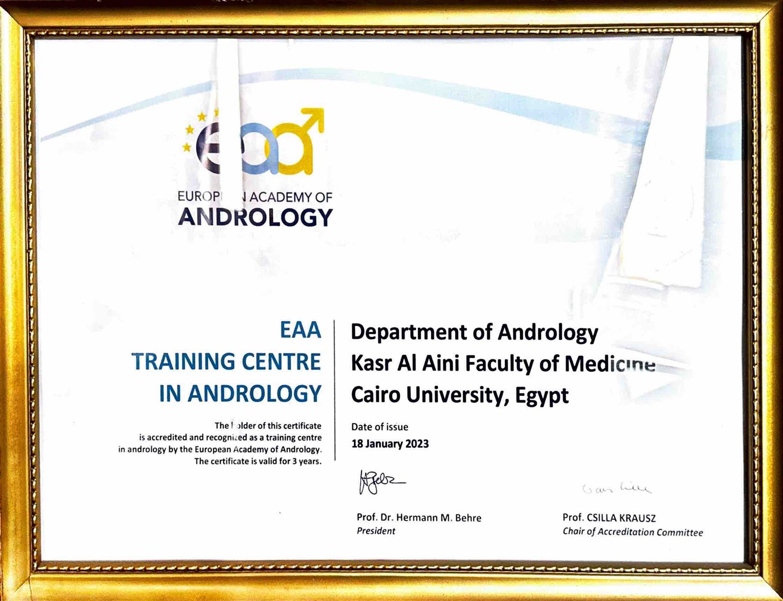 في إنجاز جديد يُضاف إلى سجل كلية طب قصر العيني العريق، نال قسم أمراض الذكورة للمرة الثانية شهادة الاعتماد من الأكاديمية الأوروبية لأمراض الذكورة (EAA Training Centre in Andrology)، ليُجدد ريادته كأحد أبرز مراكز التميز العلمي والإكلينيكي في المنطقة.