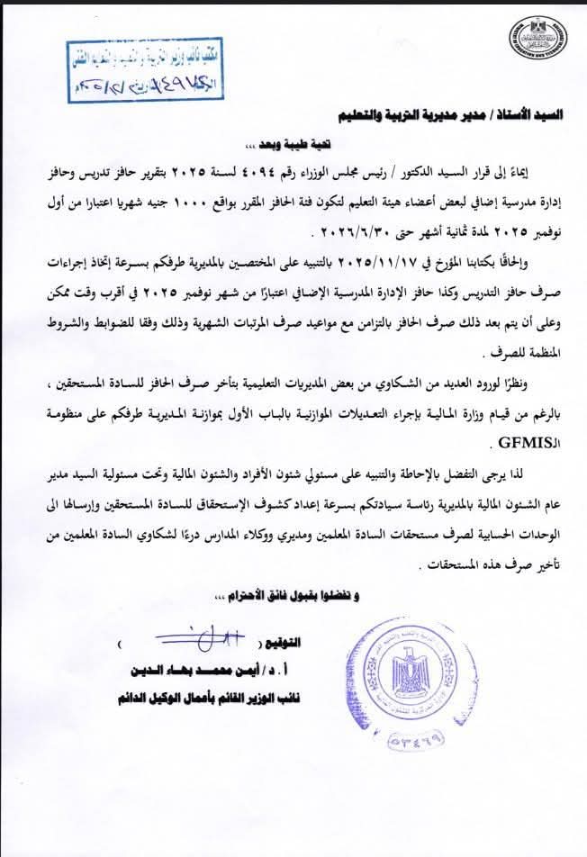 وجهت وزارة التربية والتعليم والتعليم الفني خطابا بشأن صرف حافز التدريس وحافز الإدارة المدرسية الإضافي لبعض أعضاء هيئة التعليم لتكون فئة الحافز المقرر بواقع ۱۰۰۰ جنيه شهريا اعتبارا من أول نوفمبر ۲۰۲٥ لمدة ثمانية أشهر حتى ٢٠٢٦/٦/٣٠.