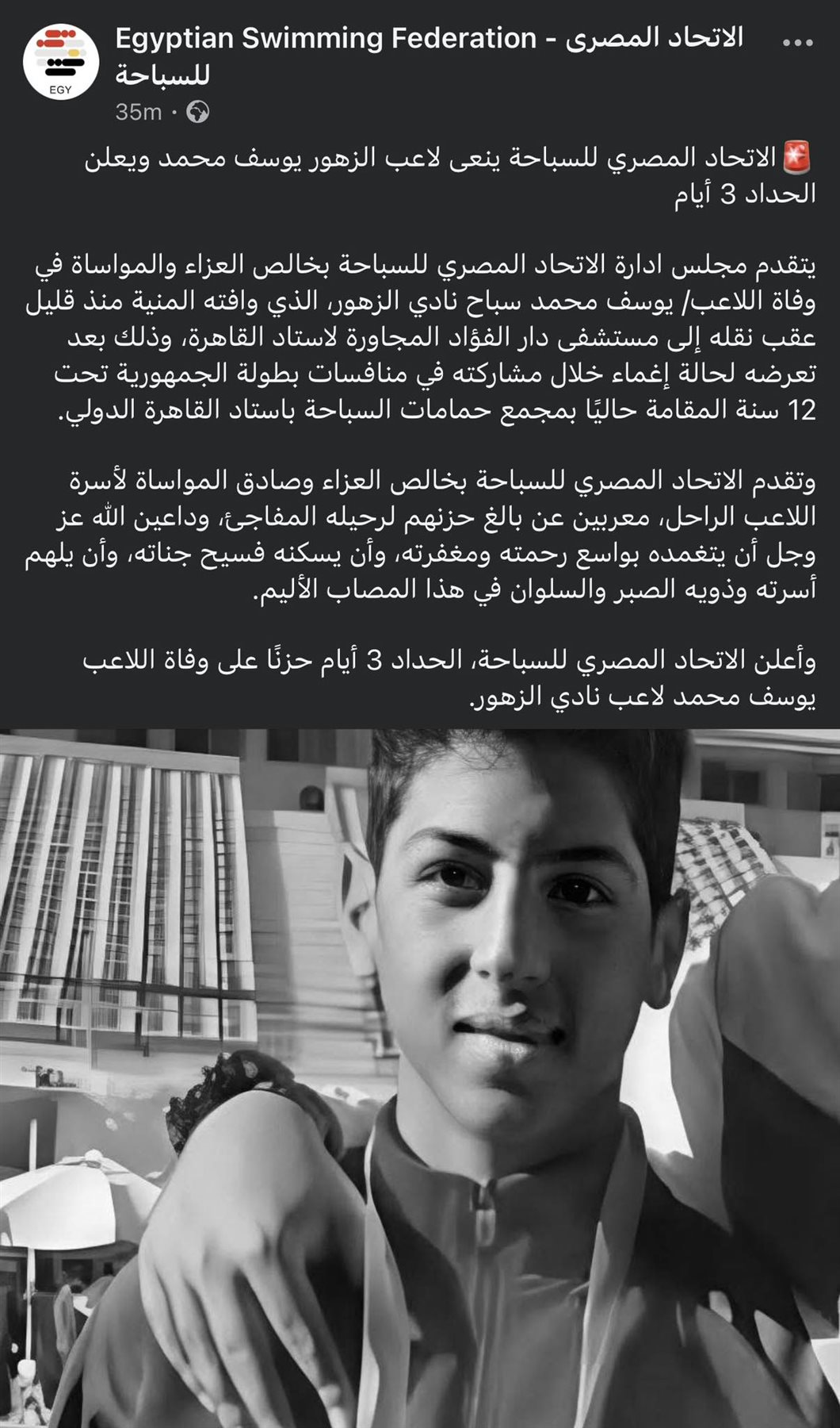 أعلن الاتحاد المصري للسباحة الحداد لمدة ثلاثة أيام حزنًا على وفاة السباح يوسف محمد لاعب نادي الزهور، حيث أعرب عن بالغ أسفهم لرحيله، داعين الله أن يتغمده برحمته ويعين أسرته على تجاوز هذه المحنة.