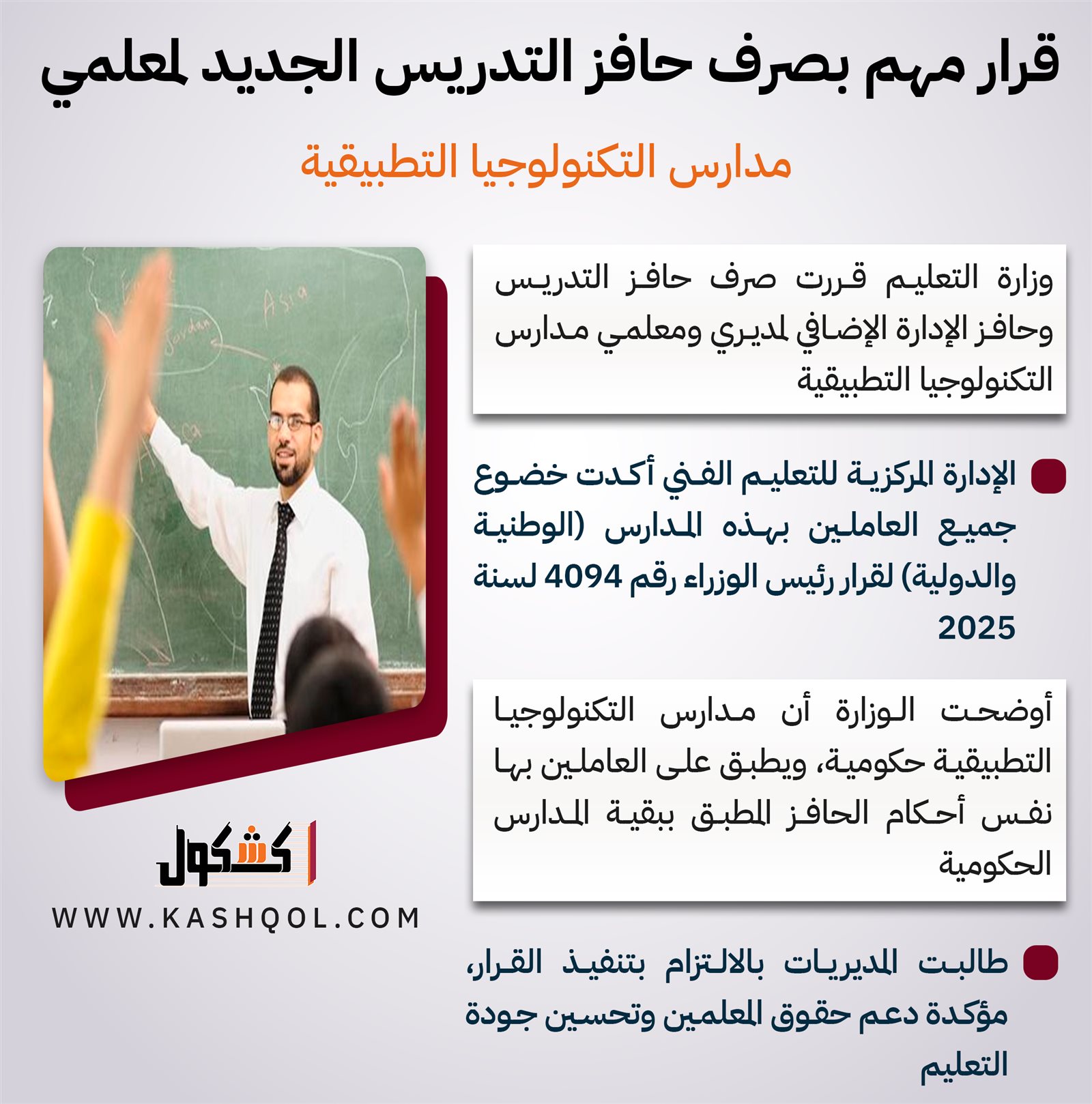 قرار مهم بصرف حافز التدريس الجديد لمعلمي مدارس التكنولوجيا التطبيقية «انفوجراف»