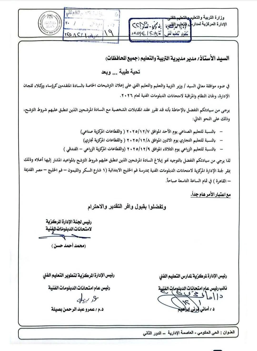 مواعيد المقابلات الشخصية للمرشحين للعمل رؤساء ووكلاء لجان بامتحانات الدبلومات الفنية 2026