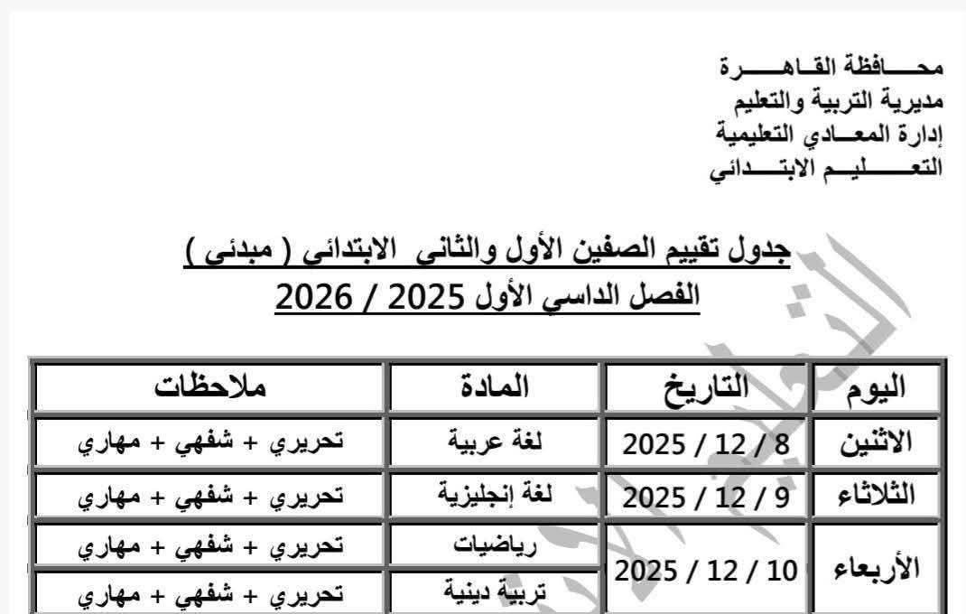 أعلنت مديرية التربية والتعليم والتعليم الفني بمحافظة القاهرة، جدول التقييم المبدئي لطلاب الصف الأول والثاني الابتدائي بالفصل الدراسي الأول للعام الحالي 2025/2026.