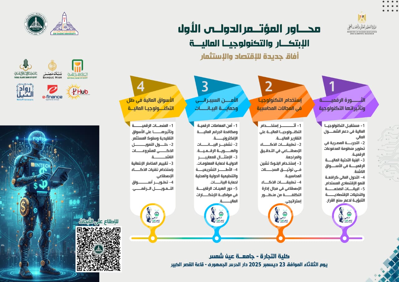 ويأتي المؤتمر ليطرح رؤية مستقبلية شاملة للاقتصاد الرقمي من خلال أربعة محاور رئيسية تشمل: الثورة الرقمية والتكنولوجيا المالية، استخدام التكنولوجيا في العلوم المحاسبية، الأمن السيبراني وحماية البيانات، والأسواق المالية في ظل التحول الرقمي.