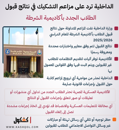 انفوجراف.. الداخلية ترد على مزاعم التشكيك في نتائج قبول الطلاب الجدد بأكاديمية الشرطة