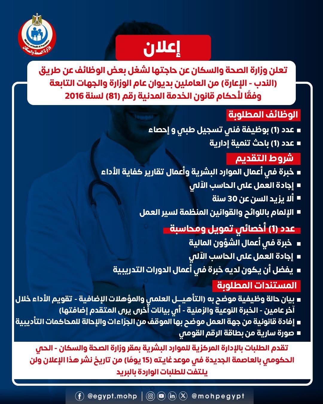أعلنت وزارة الصحة والسكان عن حاجتها لشغل بعض الوظائف عن طريق (الندب - الإعارة) من العاملين بديوان عام الوزارة والجهات التابعة، وفقًا لأحكام قانون الخدمة المدنية رقم (٨١) لسنة ٢٠١٦