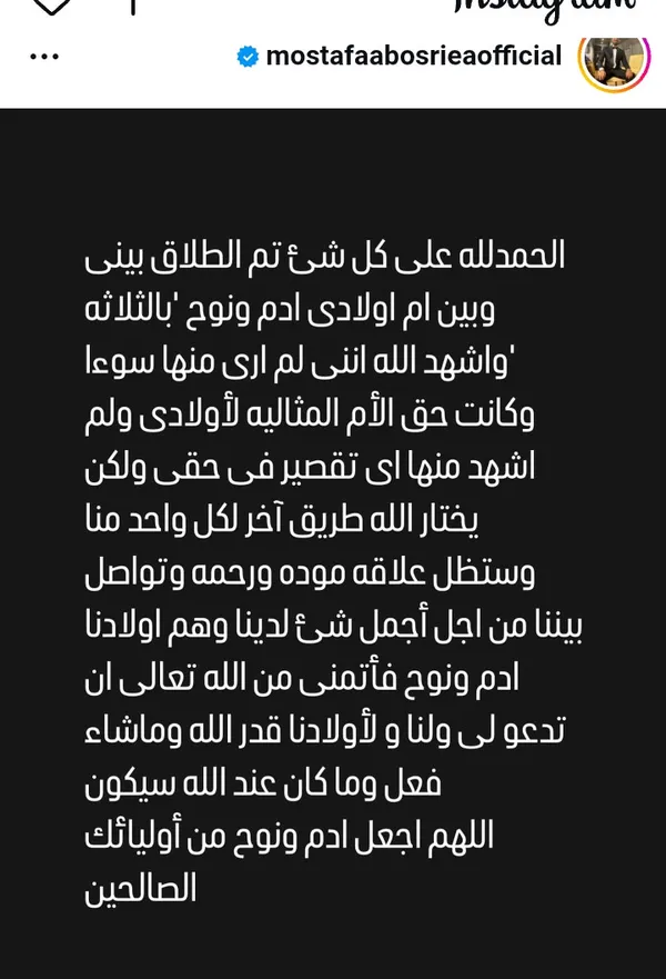 أعلن أمس الفنان مصطفى أبو سريع عبر حسابه الخاص في "إنستغرام" عن طلاقه لزوجته أم ولديه آدم ونوح، طلاقًا بائنًا بالثلاثة.