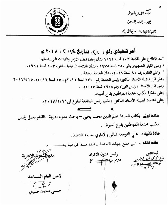 قرَّرت جامعة الأزهر فرع أسيوط، ترقية علم الدين محمد يحيى، باحث شئون إدارية أول، للقيام بعمل رئيس مكتب خدمة الموطنين.