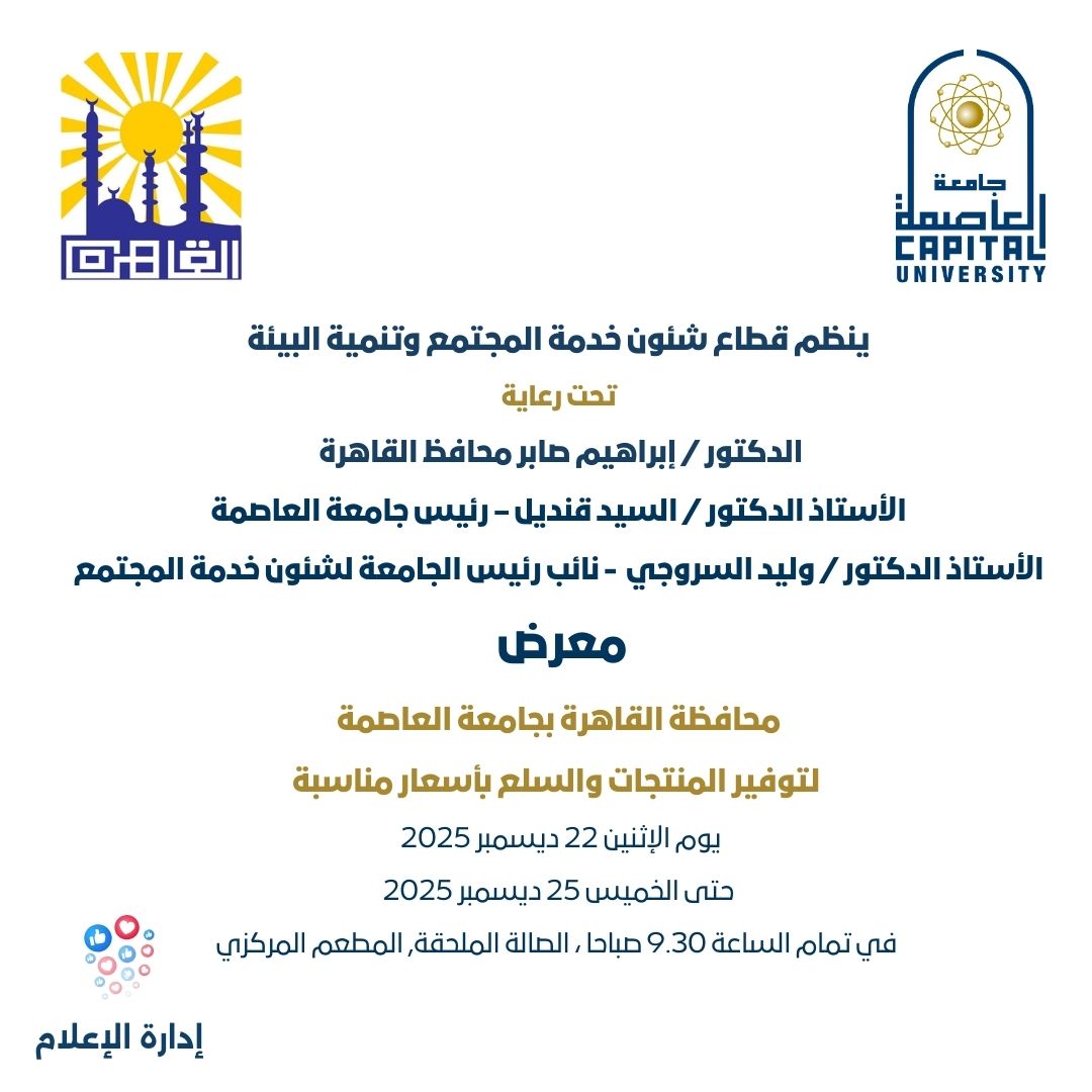 أعلنت جامعة العاصمة ممثلة في قطاع شئون خدمة المجتمع وتنمية البيئة وبالتعاون مع محافظة القاهرة عن تنظيم معرض متكامل لتوفير السلع الغذائية والمنتجات المتنوعة بأسعار مناسبة، وذلك في إطار توجيهات الرئيس عبدالفتاح السيسي لتخفيف الأعباء عن المواطنين وتيسير حصولهم على السلع والخدمات.
