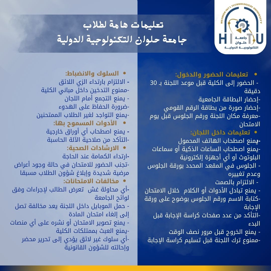 أعلنت جامعة حلوان التكنولوجية الدولية عن حزمة من التعليمات والإرشادات التنظيمية الهامة للطلاب، وذلك في إطار الاستعداد لبدء امتحانات الفصل الدراسي الأول للعام الجامعي 2025/2026، بما يضمن انتظام سير الامتحانات وتحقيق أعلى درجات الانضباط داخل اللجان، وذلك تحت رعاية الدكتور السيد قنديل رئيس جامعة حلوان، وإشراف الدكتور أسامة القبيصي المشرف الأكاديمي لـ جامعة حلوان التكنولوجية الدولية ورئيس لجنة سير الامتحانات، وبمتابعة الدكتور أحمد سويدان منسق برنامج تكنولوجيا الميكاترونكس.