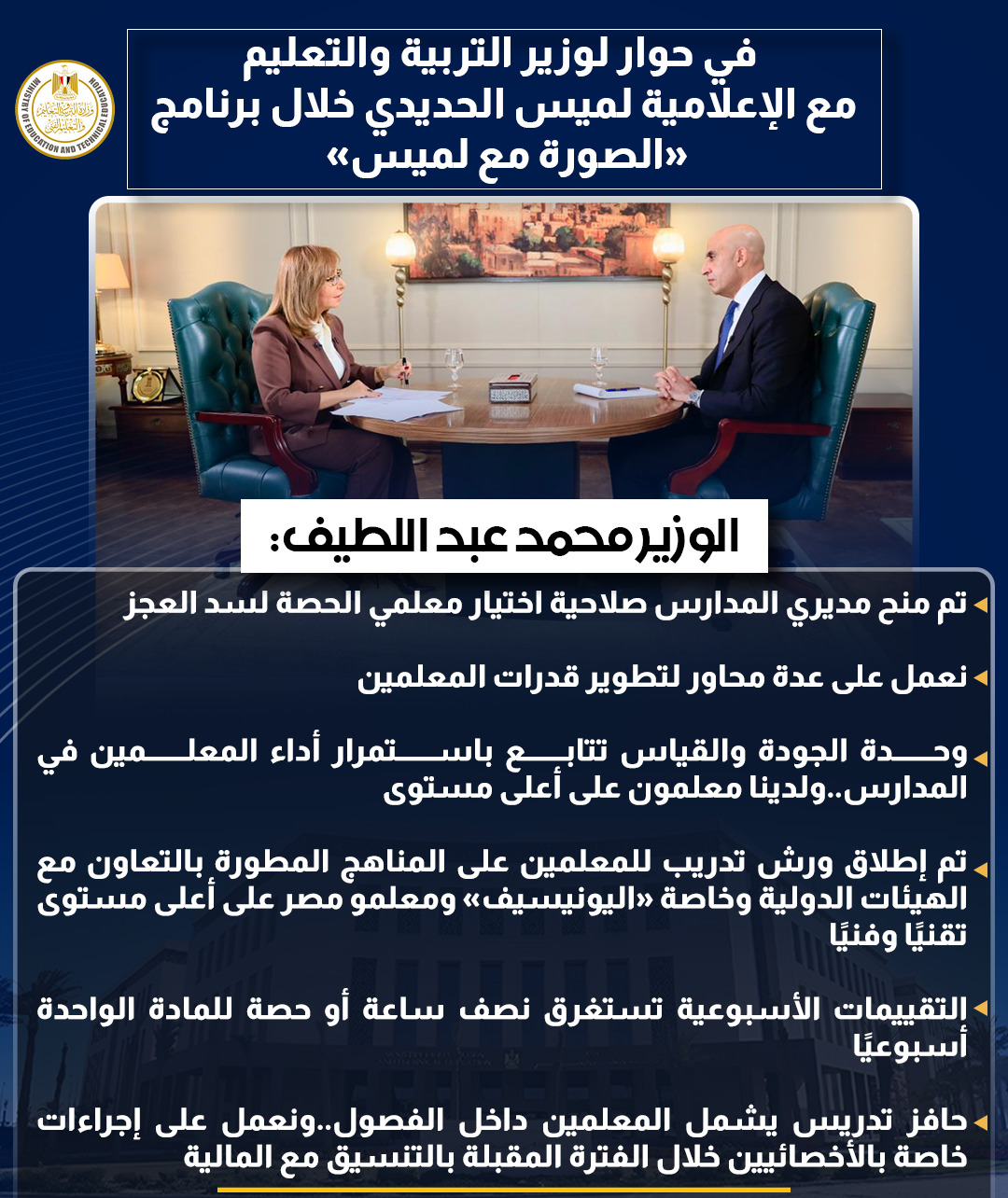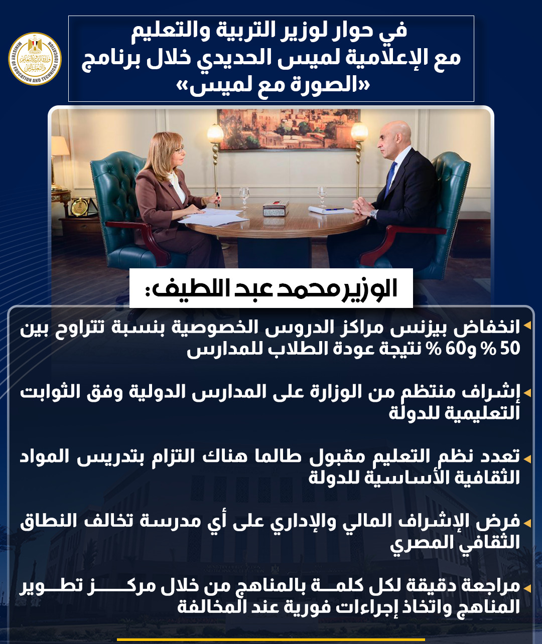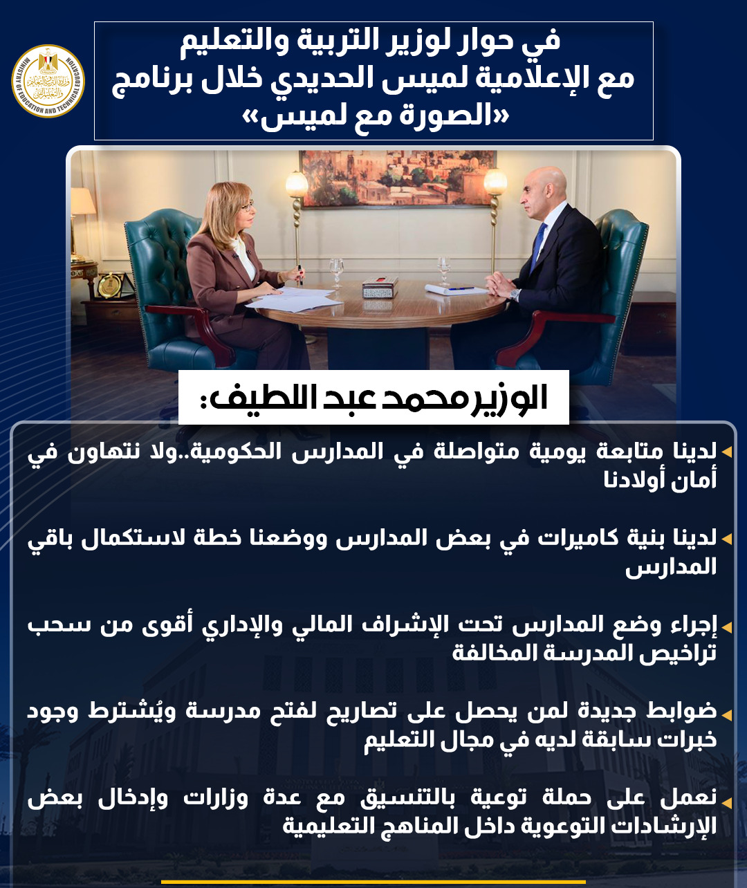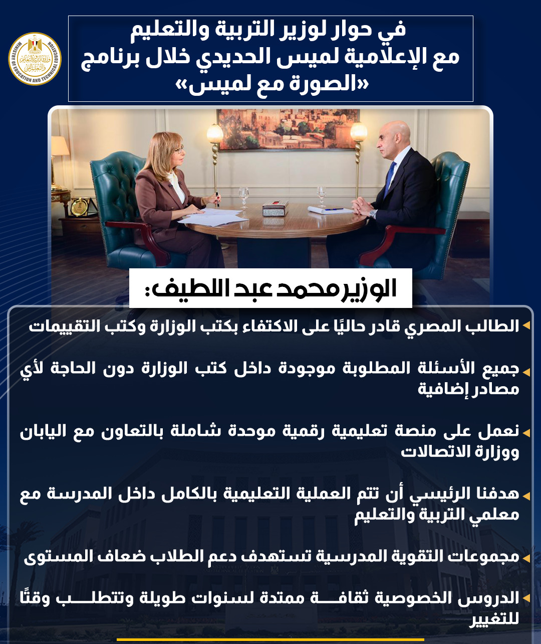 ونشرت وزارة التربية والتعليم إنفوجرفًا لتصريحات الوزير محمد عبداللطيف خلال برنامج «الصورة مع لميس» والتي جاءت كالتالي: