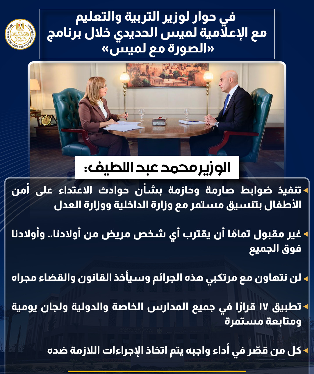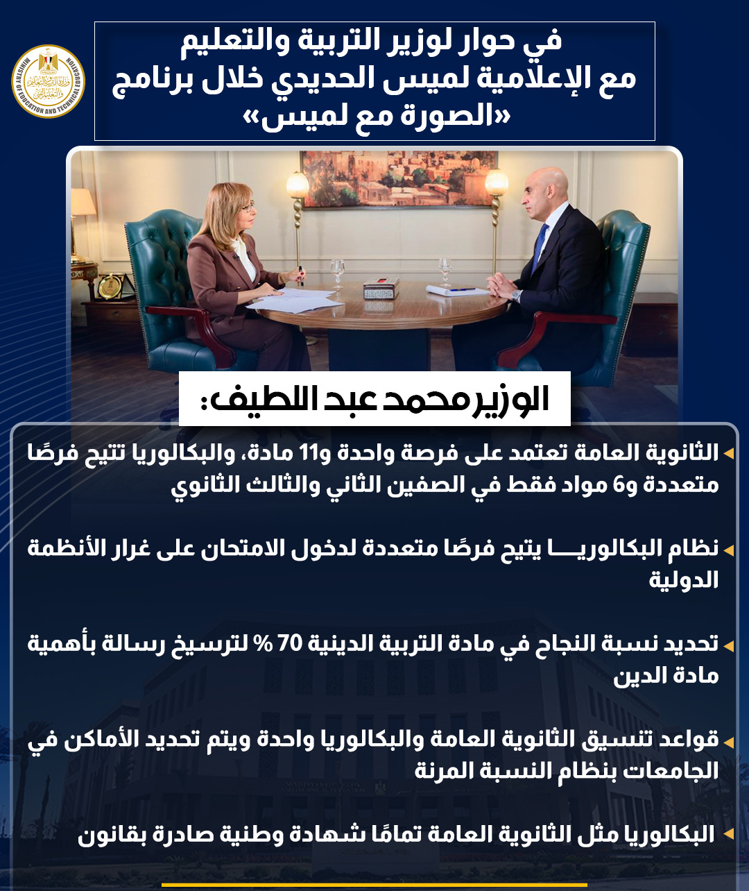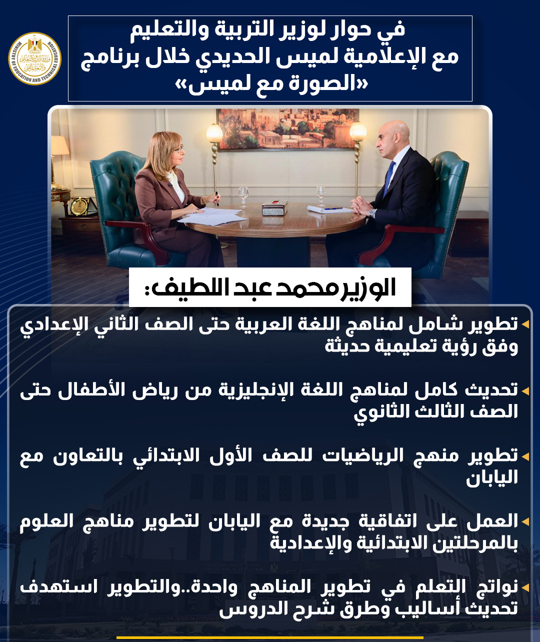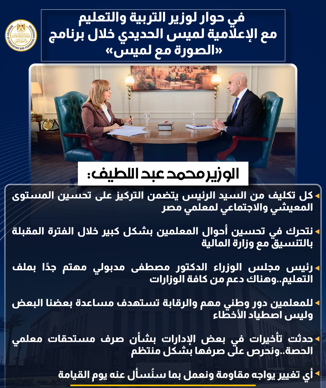 ونشرت وزارة التربية والتعليم إنفوجرفًا لتصريحات الوزير محمد عبداللطيف خلال برنامج «الصورة مع لميس» والتي جاءت كالتالي: