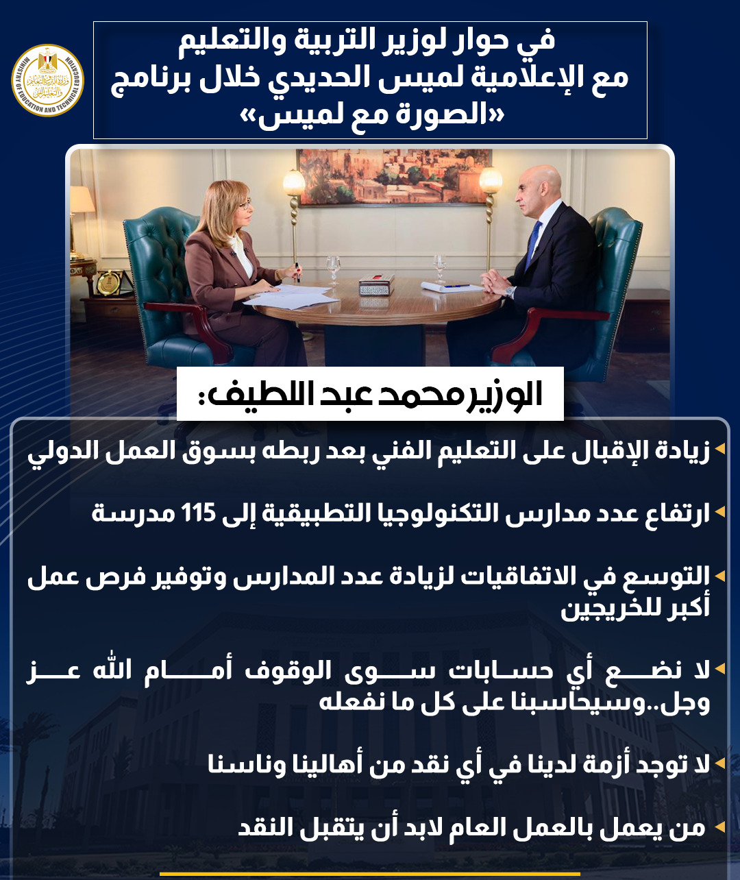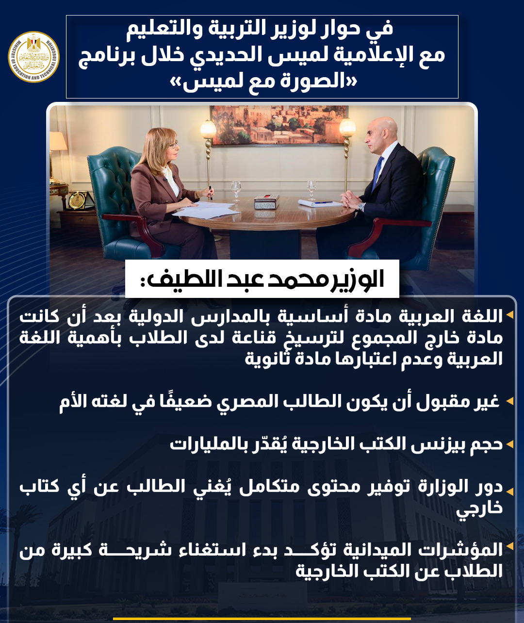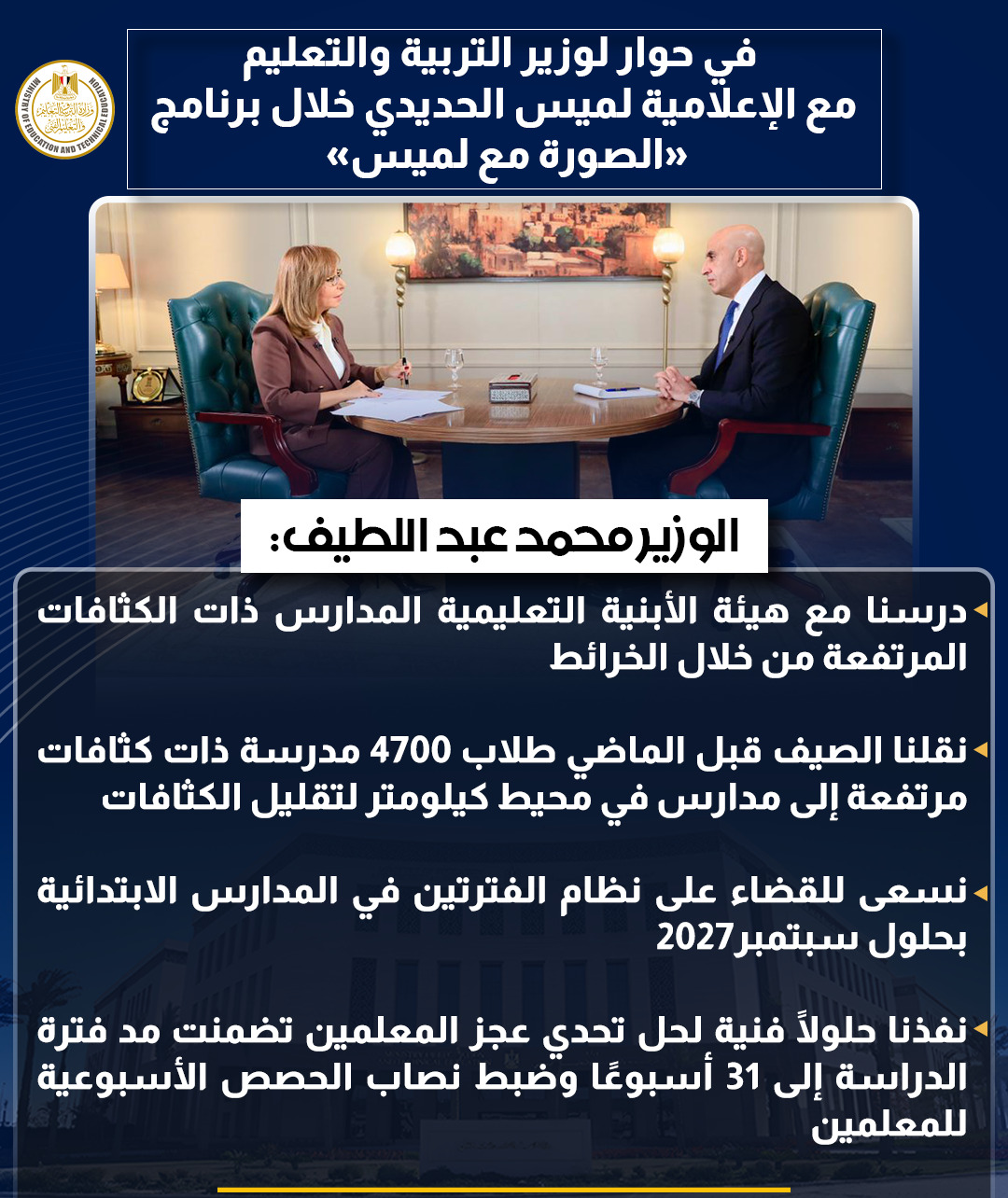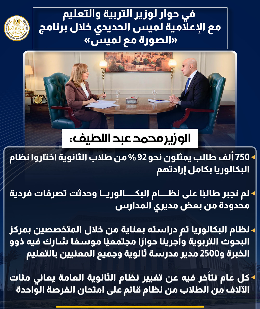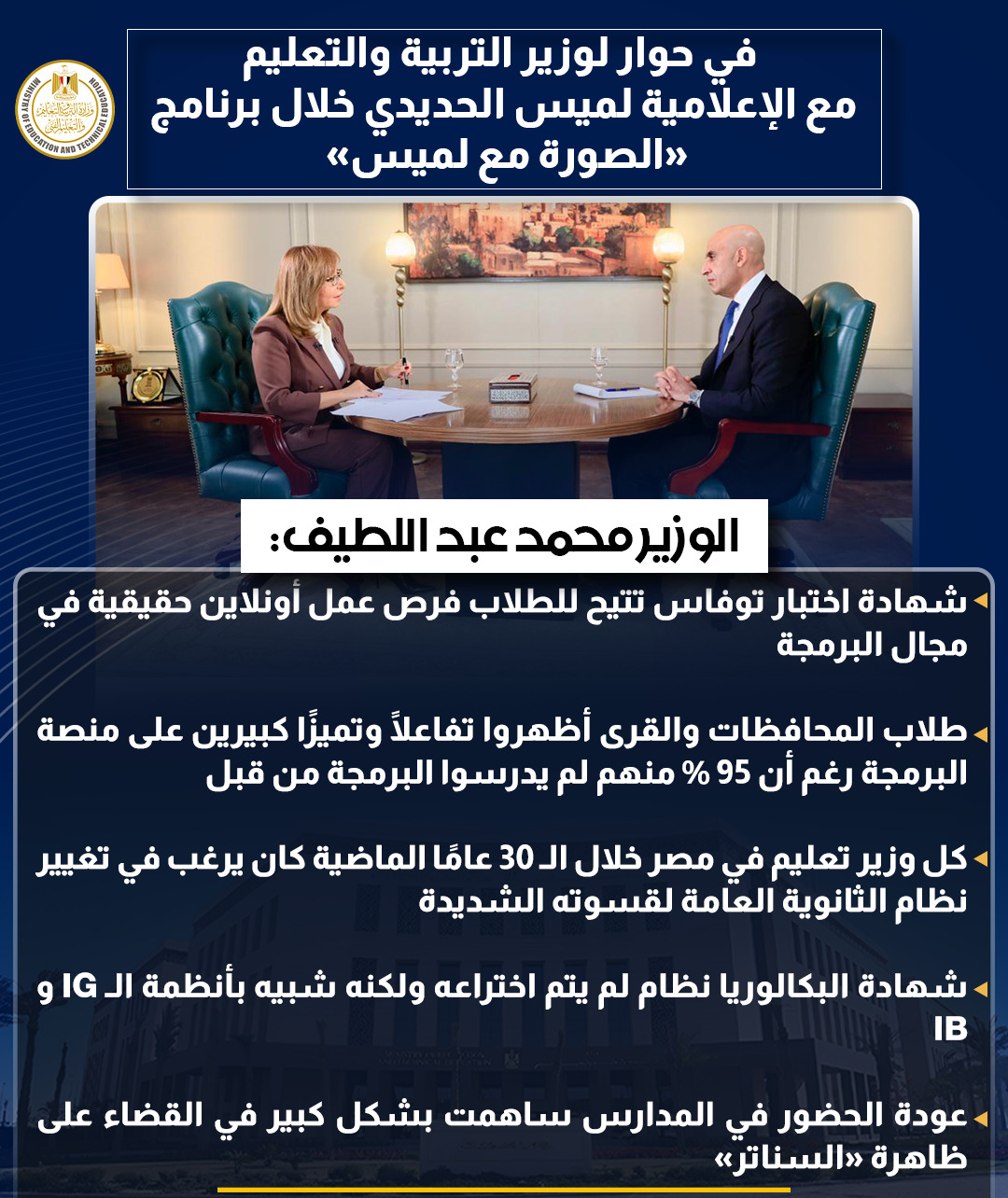 ونشرت وزارة التربية والتعليم إنفوجرفًا لتصريحات الوزير محمد عبداللطيف خلال برنامج «الصورة مع لميس» والتي جاءت كالتالي: