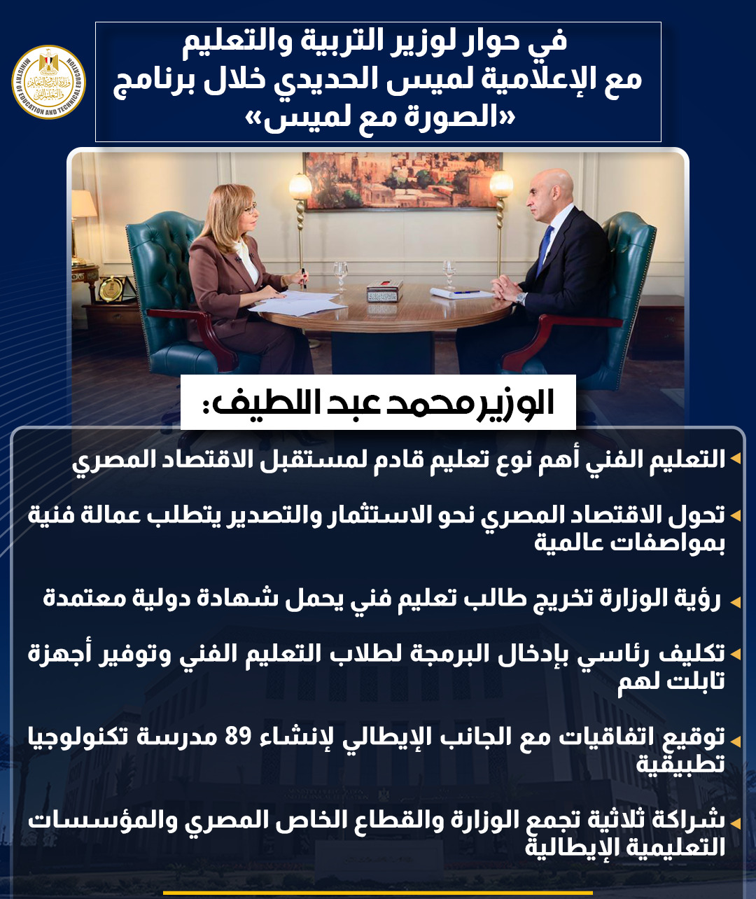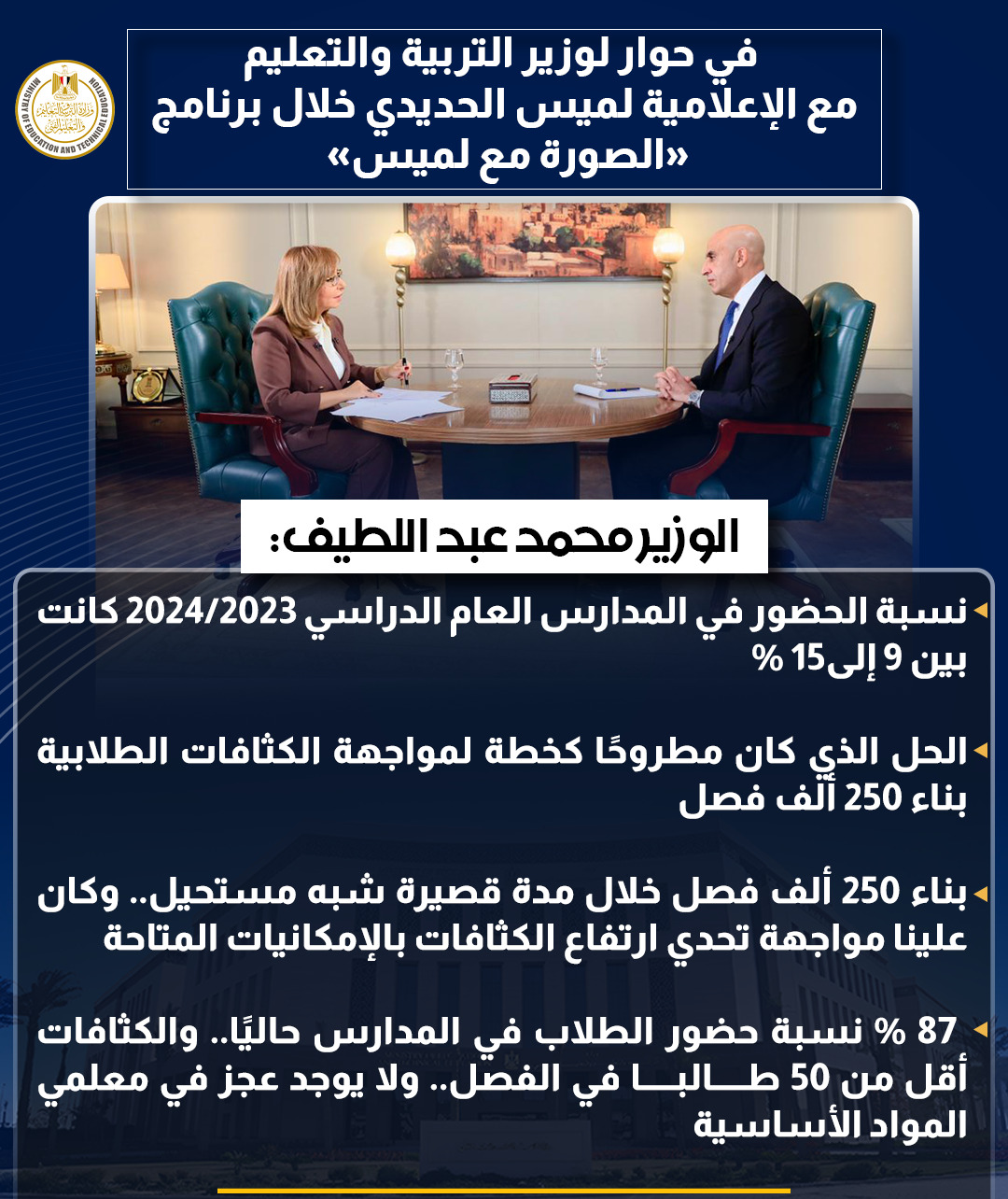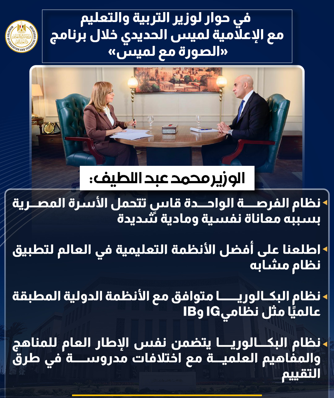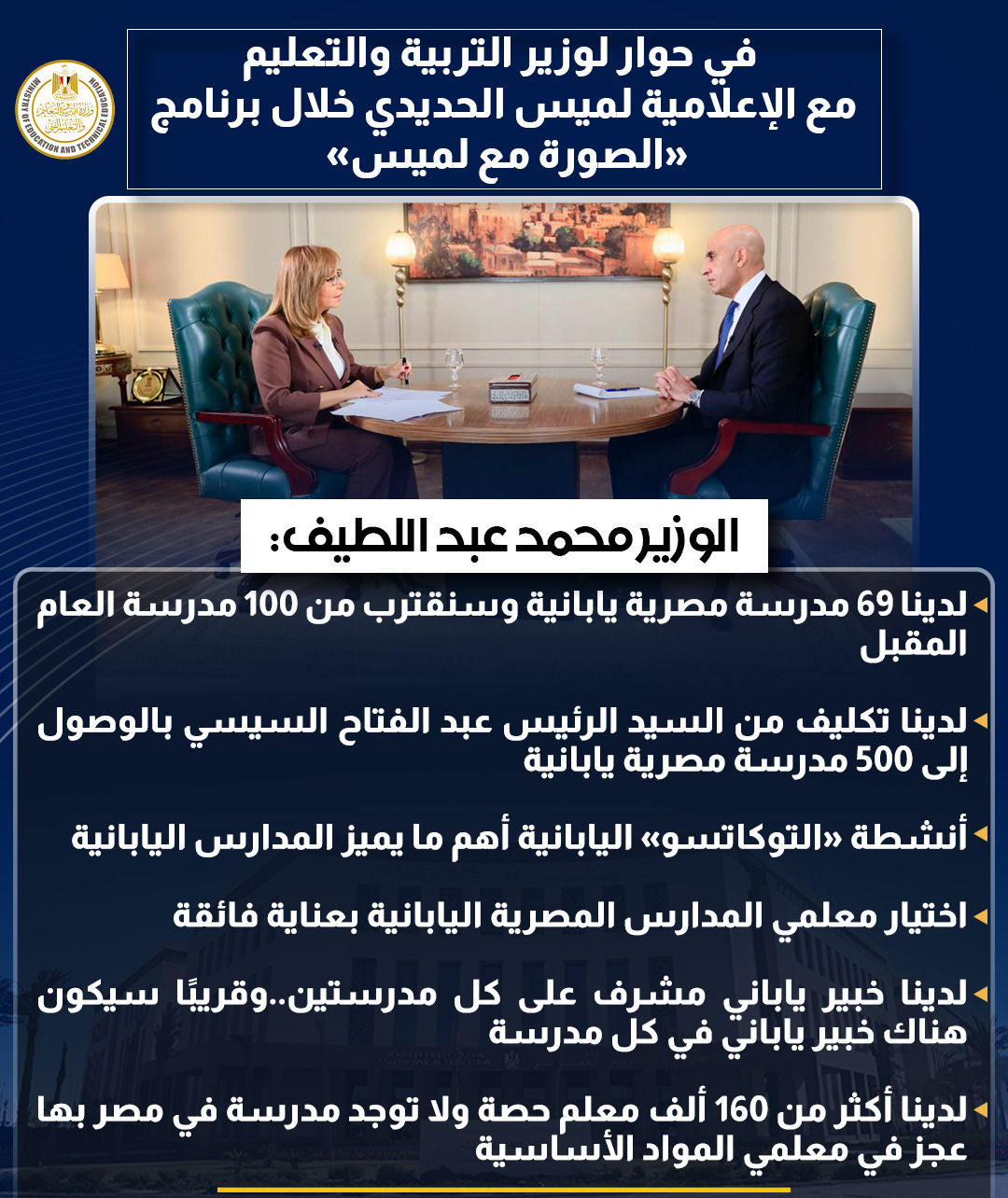 ونشرت وزارة التربية والتعليم إنفوجرفًا لتصريحات الوزير محمد عبداللطيف خلال برنامج «الصورة مع لميس» والتي جاءت كالتالي: