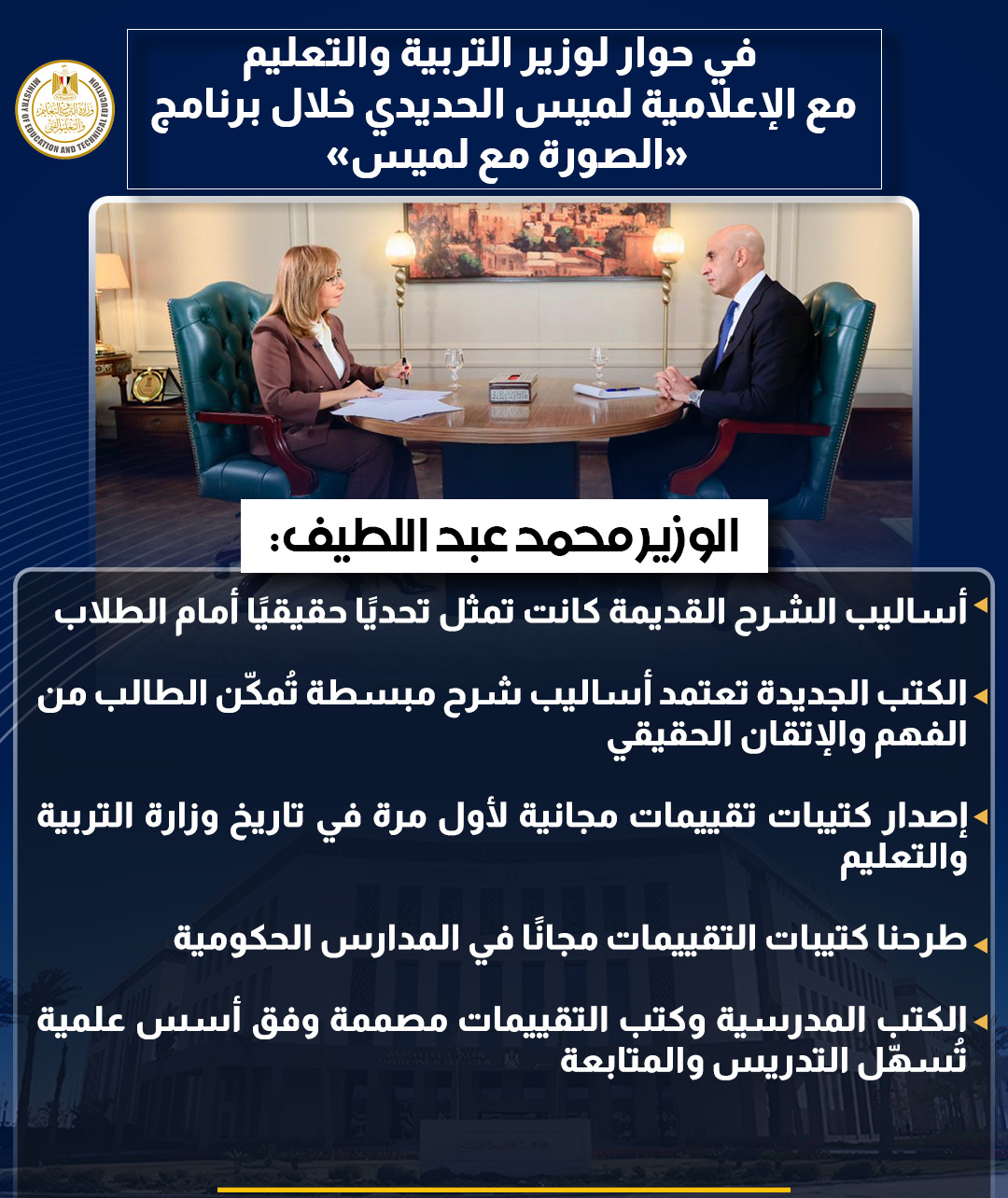 كشفت وزارة التربية والتعليم والتعليم الفني عن أبرز تصريحات الوزير محمد عبداللطيف في برنامج «الصورة مع لميس» الذي تقدمه الإعلامية لميس الحديدي على قناة النهار.