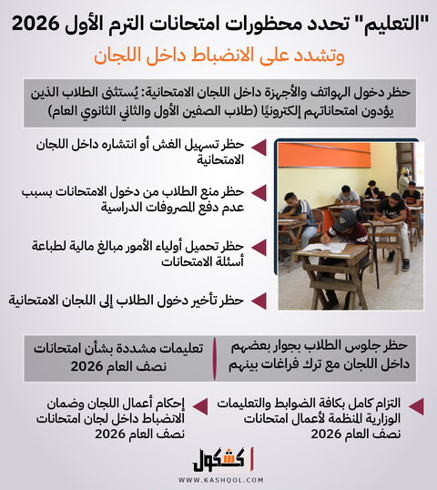 جراف انفوجراف.. "التعليم" تحدد محظورات امتحانات الترم الأول 2026 وتشدد على الانضباط داخل اللجان الخميس 25/ديسمبر/2025 - 10:14 م 12/25/2025 10:14:54 PM طباعة facebook twitter whats شارك جراف التعليم امتحانات الترم الأول