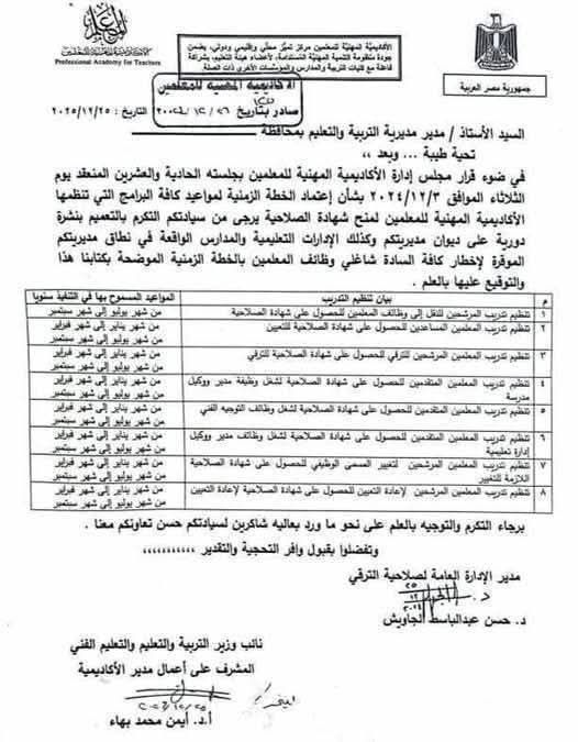 مواعيد التدريبات لمنح شهادة الصلاحية اللازمة لترقي المعلمين سنويا