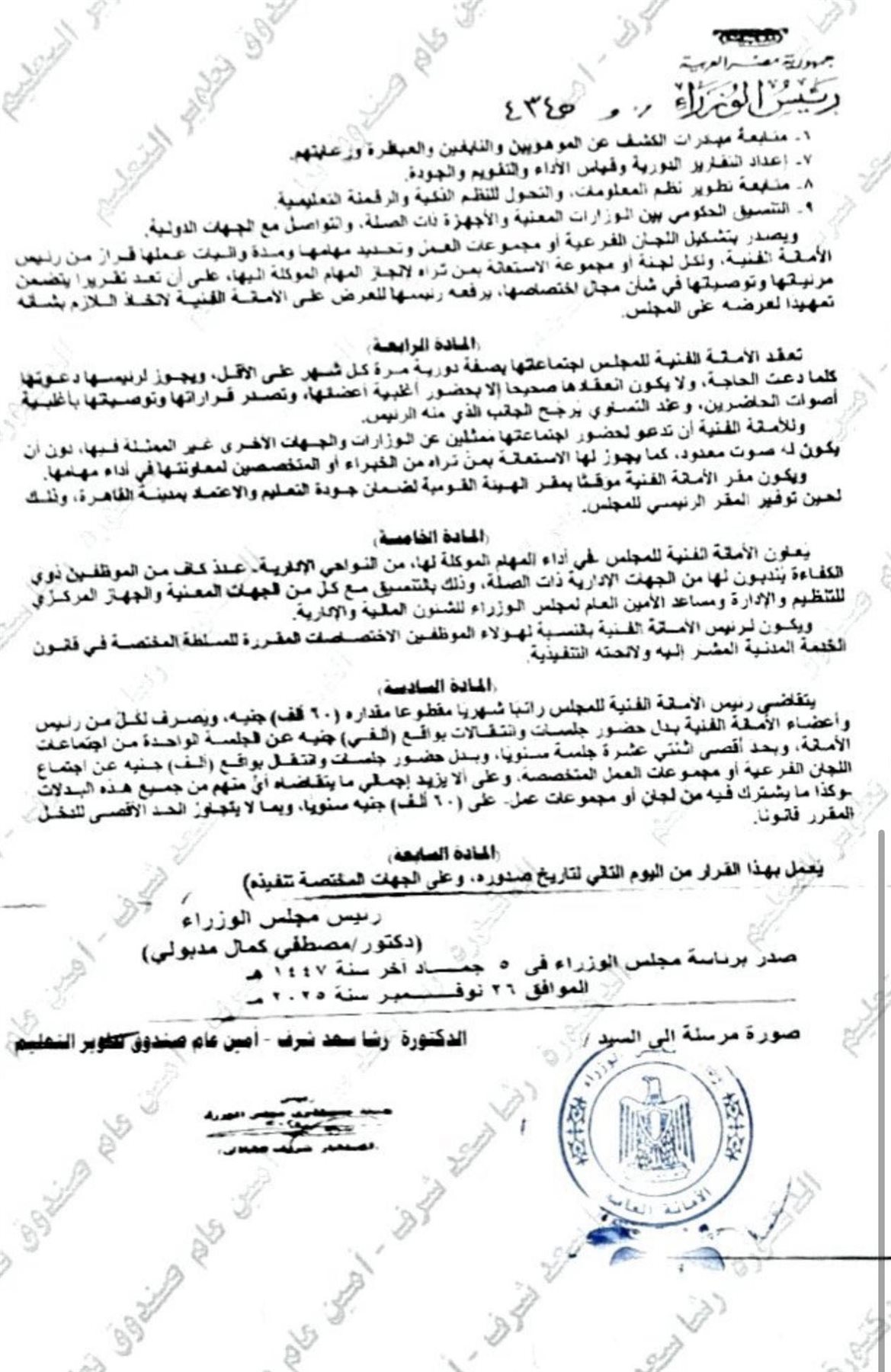 أصدر الدكتور مصطفي مدبولى رئيس مجلس الوزراء قرارا بتشكيل الأمانة الفنية للمجلس الوطني للتعليم والبحث والابتكار وتعيين الدكتورة رشا شرف الأمين العام لصندوق تطوير التعليم برئاسة مجلس الوزراء من العلماء والخبراء فى مجالات التعليم والبحث والابتكار وذلك لدعم الكفاءات العلمية وتعزيز منظومة العمل المؤسسي.