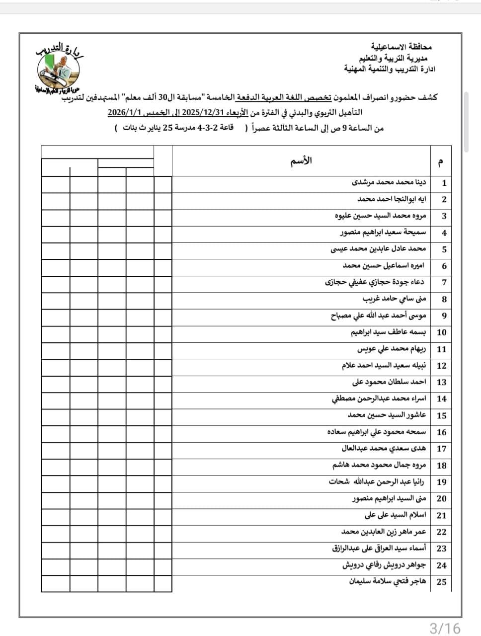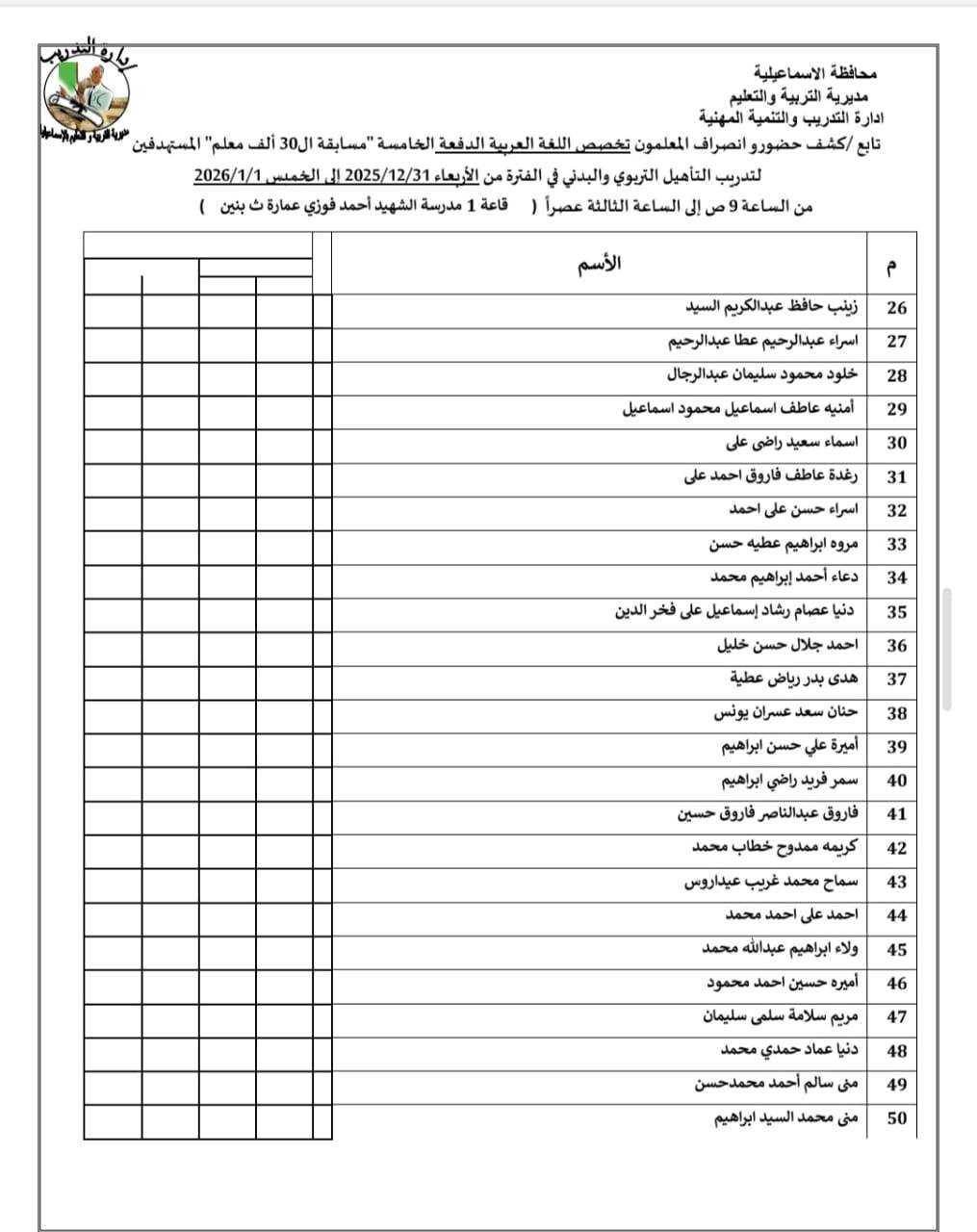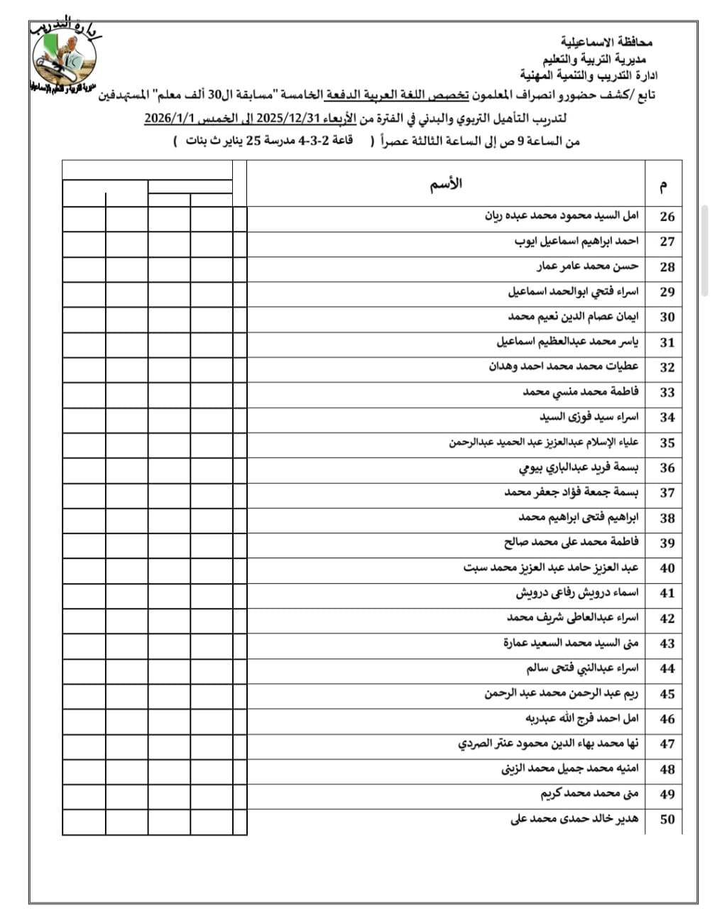أعلنت مديرية التربية والتعليم والتعليم الفني بمحافظة الإسماعيلية، بدء تتفيذ البرنامج التدريبي التأهيل التربوي والبدني والذهني للمعلمون الجدد الدفعة الخامسة تخصص اللغة العربية وايضا لم تغيبوا عن حضور البرنامج من الدفعة الخامسة في تخصص الرياضيات واللغة الانجليزية يومي الاربعاء والخميس بالقاعات ممن اجتازوا اختبارات الجهاز المركزي للتنظيم والإدارة من الدفعة الخامسة تخصص اللغة العربية.