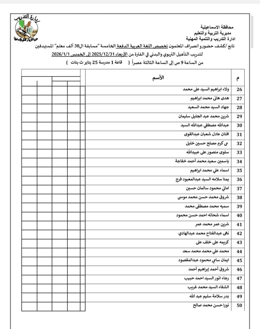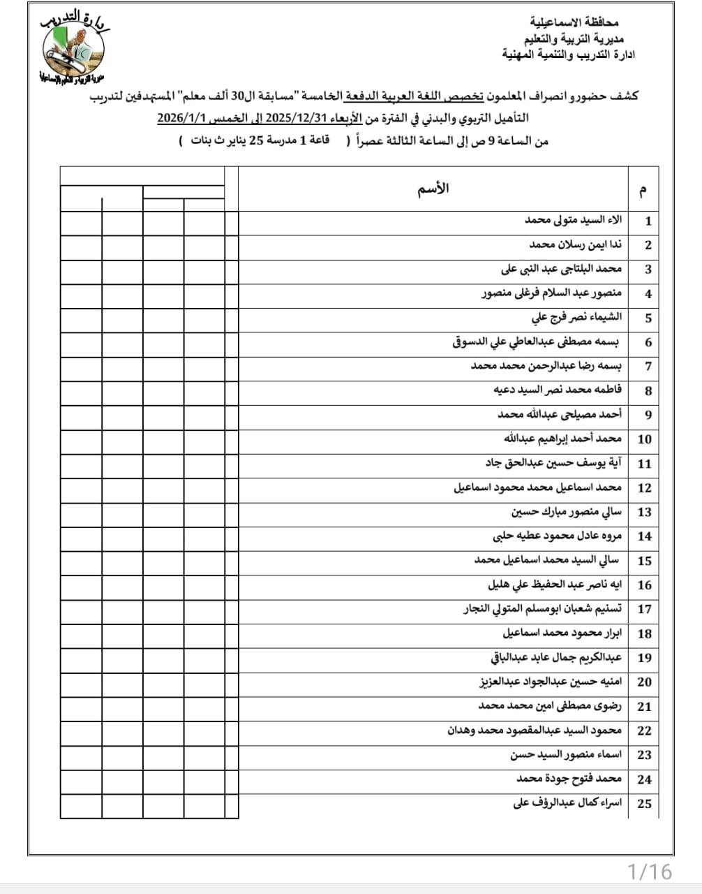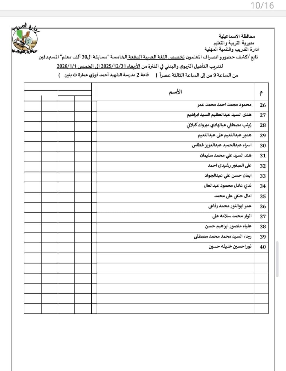 أعلنت مديرية التربية والتعليم والتعليم الفني بمحافظة الإسماعيلية، بدء تتفيذ البرنامج التدريبي التأهيل التربوي والبدني والذهني للمعلمون الجدد الدفعة الخامسة تخصص اللغة العربية وايضا لم تغيبوا عن حضور البرنامج من الدفعة الخامسة في تخصص الرياضيات واللغة الانجليزية يومي الاربعاء والخميس بالقاعات ممن اجتازوا اختبارات الجهاز المركزي للتنظيم والإدارة من الدفعة الخامسة تخصص اللغة العربية.