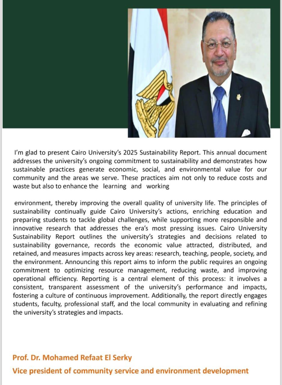 رئيس جامعة القاهرة: التقرير يؤكد اتخاذ الجامعة لإجراءات عدة للاستدامة كحوكمة اللامركزية وتحويل وحدات الكليات والمعاهد للتنافسية فى التميز البيئي واعتماد مؤشرات التصنيفات العالمية كمرجعية للقياس