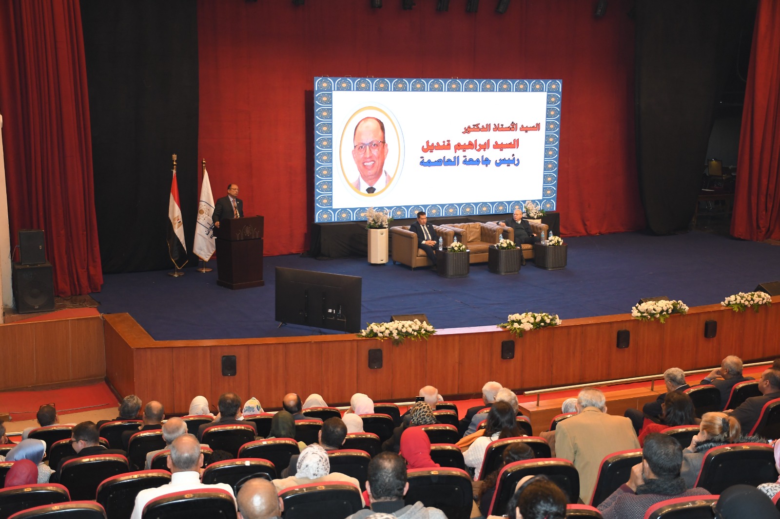وفي كلمته، رحب الدكتور قنديل رئيس جامعة العاصمة (حلوان سابقًا) بالعلماء والباحثين والإداريين، مؤكدًا أن البحث العلمي هو المعيار الحقيقي الذي يقاس به حجم الجامعة وتأثيرها ودورها في خدمة المجتمع، مشيرًا إلى أن الجامعة تولي البحث العلمي أولوية قصوى، وتخصص 10٪ من مواردها الذاتية لدعمه، مع التركيز بشكل خاص على الأبحاث التطبيقية ذات العائد المباشر على التنمية، مؤكدًا على أهمية البحث العلمي في الكليات النظرية بجانب العملية، مؤكدًا أن لها دورًا محوريًا في التطبيق العملي وصناعة الوعي وبناء الإنسان، مشيرًا إلى طرح الجامعة فكرة قومية بالتعاون مع جهات وطنية لترجمة تاريخ مصر إلى لغات مختلفة، دعمًا للقوة الناعمة المصرية وتعزيزًا للحضور الحضاري لمصر عالميًا.