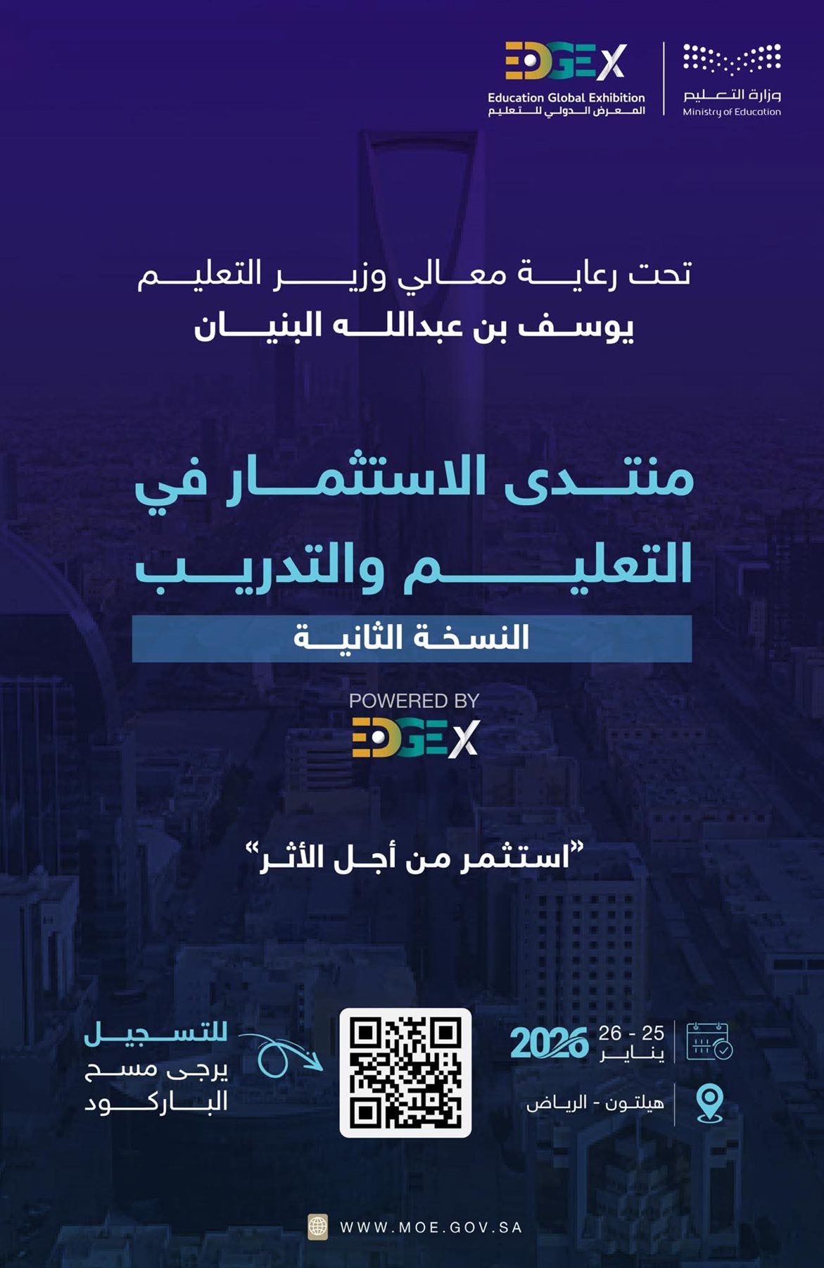 تستعد وزارة التعليم لإقامة منتدى الاستثمار في التعليم والتدريب 2026، والذي سيُقام برعاية وزير التعليم يوسف بن عبدالله البنيان، تحت شعار "استثمر من أجل الأثر"، على مدى يومين 25 و26 يناير المقبل في الرياض؛ بمشاركة العديد من الجهات الحكومية والتمويلية والاستثمارية، ومنظومة التعليم والتدريب، وأكثر من 1500 مشارك من الجهات والمؤسسات التعليمية، ونخبة من المستثمرين ورواد الأعمال والخبراء في قطاع التعليم والتدريب محليًا وعالميًا.