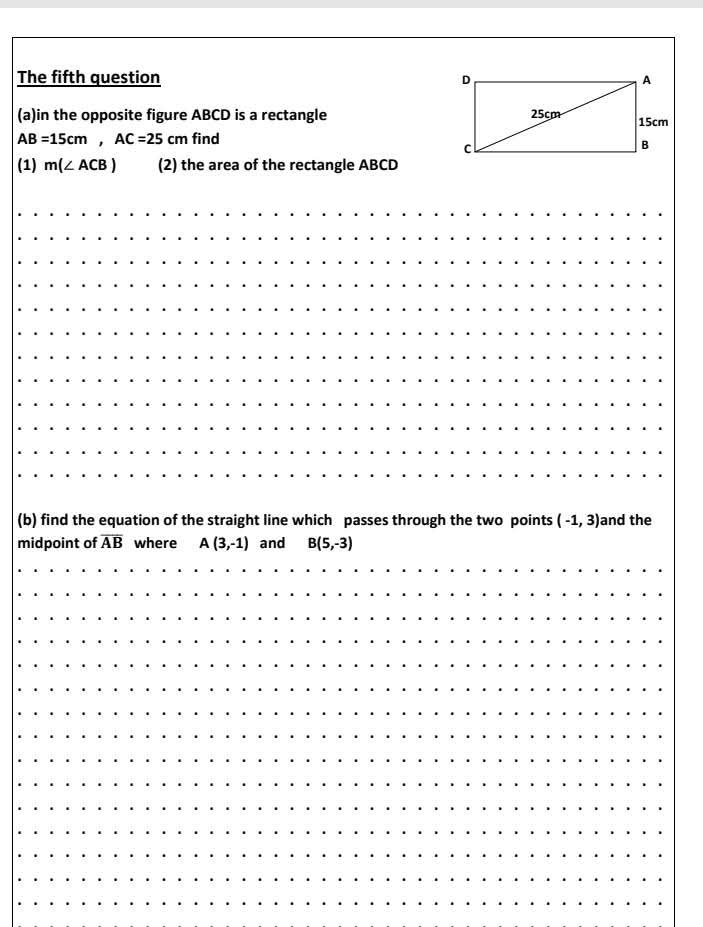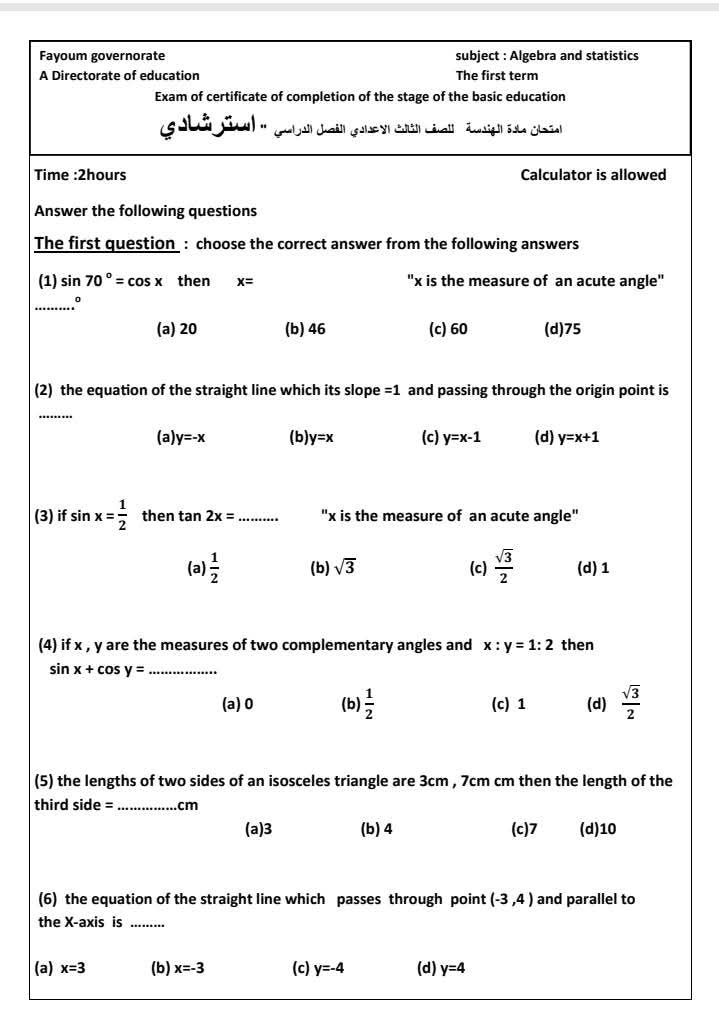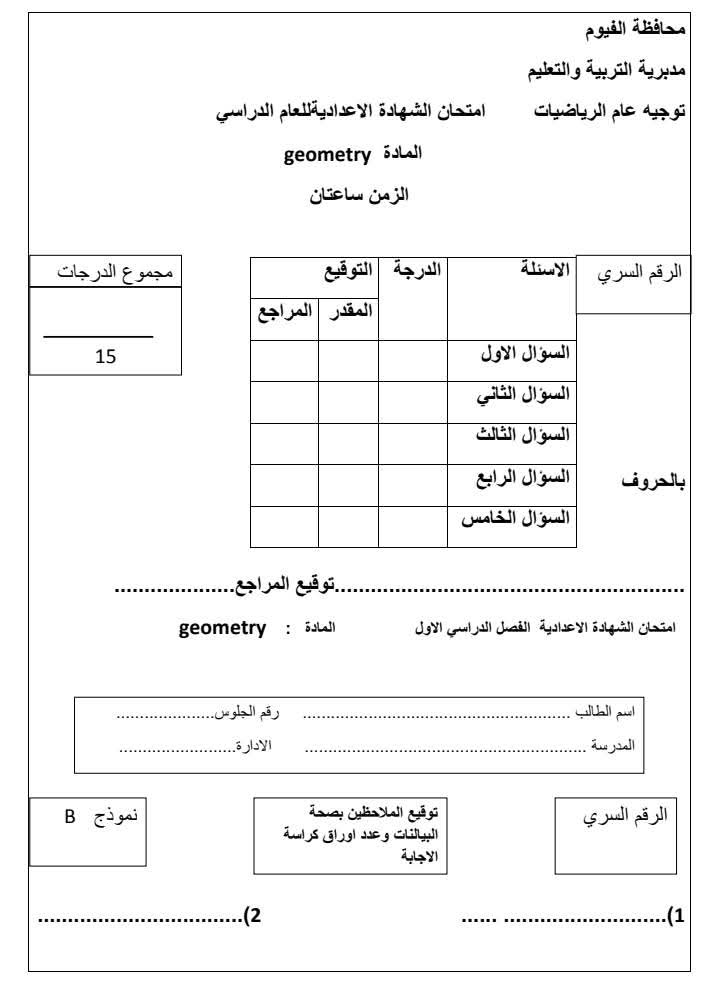 أتاحت مديرية التربية والتعليم والتعليم الفني بمحافظة الفيوم، نماذج من اختبارات تجريبية لطلاب الشهادة الإعدادية الفصل الدراسي الأول 2026 - مادة الرياضيات (Math) - الهندسة (Geometry).