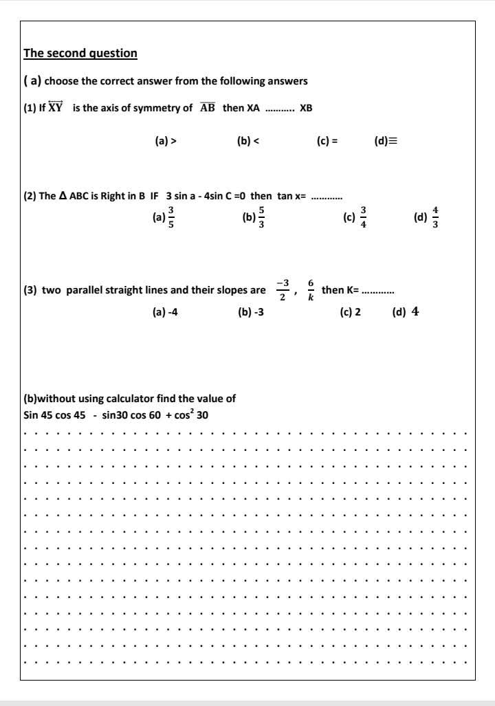وأشارت إلى أنه يمكن الحصول على نماذج من الاختبارات التجريبية لطلاب الصف الثالث الإعدادي بجميع المواد الدراسية، للعام الدراسي - الفصل الدراسي الأول، بمادة الرياضيات Math) - الهندسة (Geometry)، تمهيدًا لامتحانات الفصل الدراسي الأول 2026/2025 من خلال مطالعة الصور التالية: